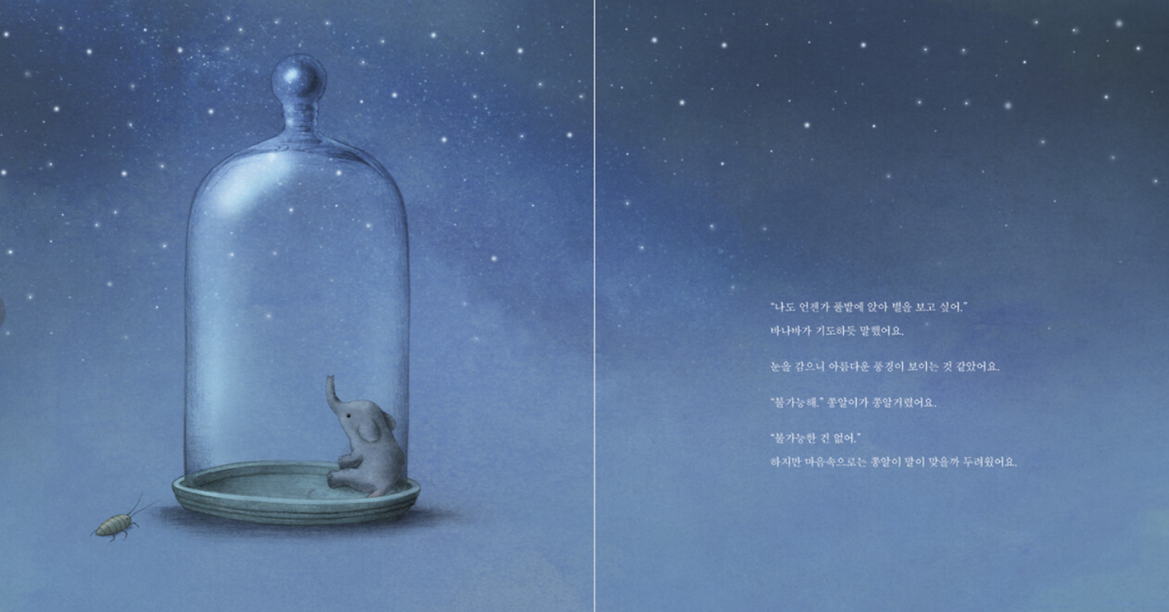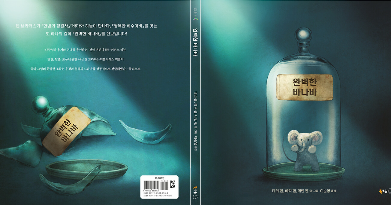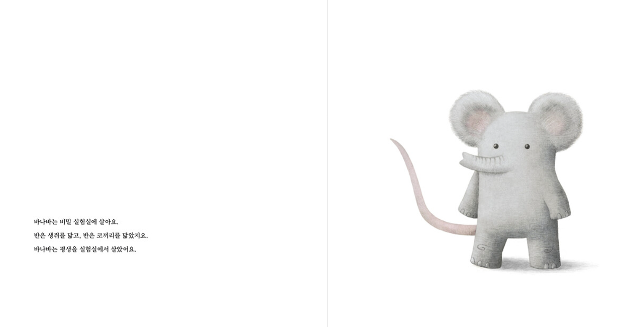 '코끼리인가?' 했더니 너무 작은 몸집에 기다란 꼬리가 보입니다. 생쥐 같기도 해요. 이 묘한 생김새를 지닌 작은 친구는 바나바입니다. 그냥 바나바가 아닌 '완벽한' 바나바이지요. 바나바는 무슨 사연인지 답답해 보이는 작은 유리병 안에 갇혀 있습니다. 유리병에 비추는 한 줄기의 햇살에 저곳이 얼마나 어두운 곳인지를 역설적으로 직감합니다. 바나바가 독자인 우리를 바라봅니다. 꼭 무언가를 말하고 싶어 하는 표정이지요. 한편, 뒤표지를 보니 바나바는 온 데 간 데 사라지고 유리병은 와장창 깨져있네요. 다행이라는 안도감이 들면서도 무척 궁금해집니다. 바나바는 어디로 간 걸까요? 바나바는 어떻게 '탈출'을 한 걸까요?