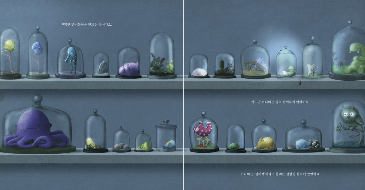 '완벽한 반려동물' 가게에는 바나바 이외에 수많은 친구들이 살고 있습니다. 모두 바나바 같이 비밀실험실에서 태어났습니다. 하지만 이들은 '완벽한' 기준에 들지 못한 후보군일 뿐입니다. 평생 밝은 해를 보지 못한 채 몸이 꽉 차는 좁은 유리병 안에서 생활합니다. 유리병 안 친구들을 살펴보니 모습이 참 제각각이네요. 자신이 왜 이런 모습으로 태어났는지 알 리가 없고, 그저 본능적으로 한 번도 본 적 없는 바깥세상을 그리워합니다.