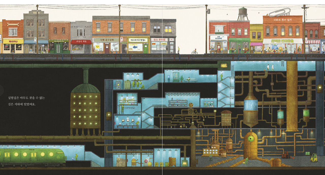 귀여운 바나바. 비밀스러운 지하 실험실에서 삽니다. 반은 생쥐, 나머지 반은 코끼리를 닮은 친구지요. 바나바는 평생 실험실에서 살아왔습니다. 손에 쏙 들어오는 보송보송 바나바. 바나바의 탄생에는 어떤 비밀이 숨겨져 있는 걸까요? 바나바가 사는 실험실은 좀처럼 눈에 띄기 쉽지 않은 은밀한 곳입니다. 평범한 마을의 땅 밑, 아무도 정체를 모를만한 그런 장소입니다. 복잡한 작은 방들이 미로처럼 연결되어 있어 바나바가 있는 방을 찾는 것도 어려워 보여요. 가만히 비밀 실험실의 단면을 살펴보면 이 실험실이 땅 위 어떤 곳과 연결되어 있는지 확인할 수 있습니다. 그곳은 가게입니다. 발리오 반려동물을 파는 펫샵이지요. '완벽한 반려동물'을 살 수 있는 펫샵. '완벽한'이라는 수식어가 반감을 불러일으킵니다. 사람들이 가게 앞에 문전성시를 이루고 있는 것을 보니 무척 인기가 많아 보이네요.