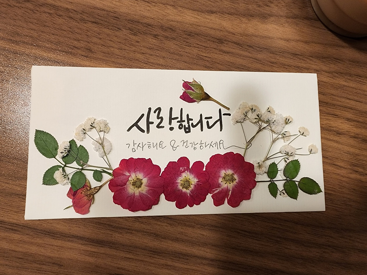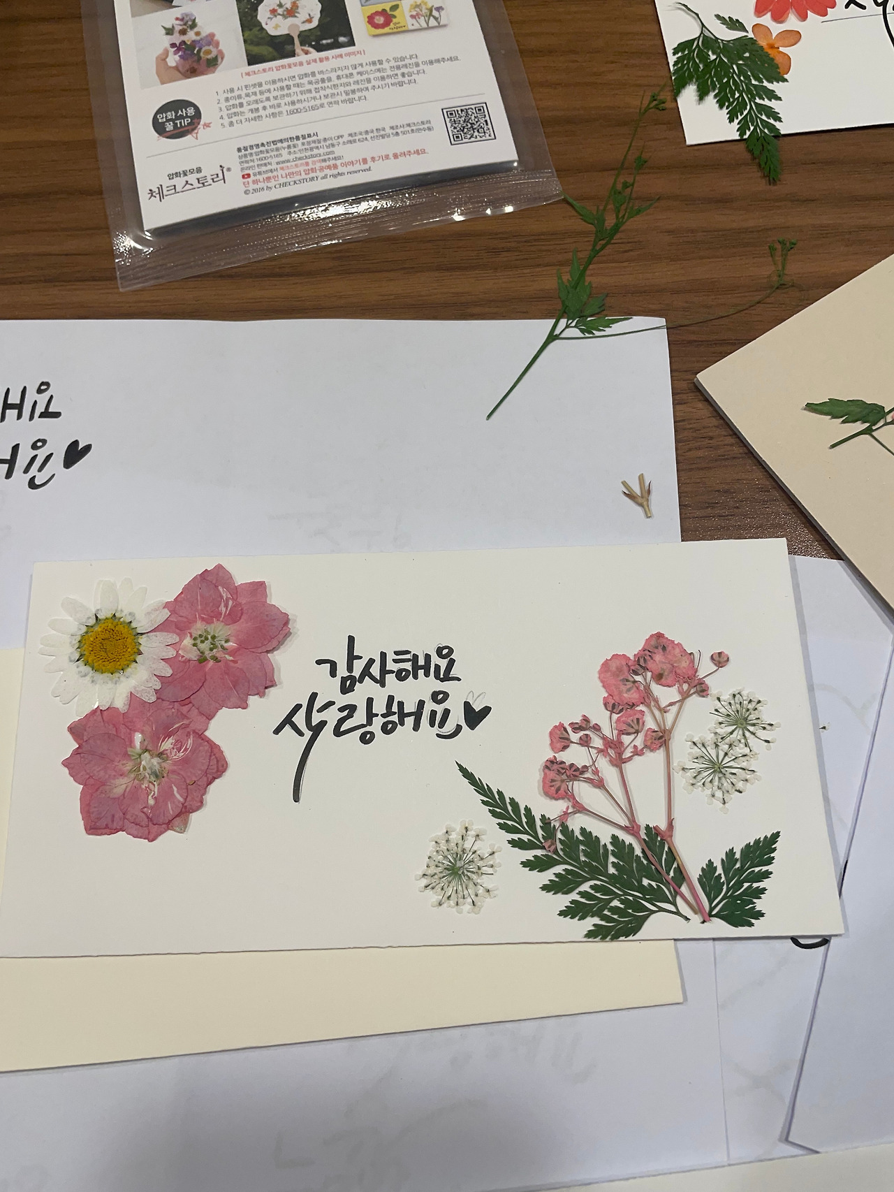 어린이날 맞이 원데이클래스를 열어보니 어버이날 원데이클래스도 해볼만하겠단 생각이 들었어요. 그래서 피곤으로 몸은 퉁퉁 부었지만 도전의지가 생겼지요. 어린이날은 '캘리문구 + 꽃 스티커'의 조합으로 아이들에게 보내는 편지액자를 만들어보았다면, 이번 어버이날은 '캘리문구 + 압화꽃(조금 더 단가가 높지만 고급진)'의 조합으로 부모님께 전하는 용돈봉투를 만들어 보았어요.
