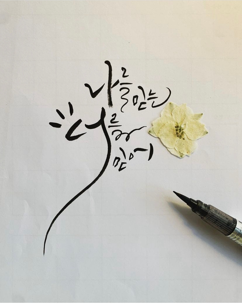 '나를 믿는 너를 믿어' 라는 말은 제가 재밌게 봤던 드라마 '스물다섯스물하나'의 명대사 중 하나에요. 제가 타인에게 '캘리그라피를 하고 있어요' 에서 '캘리그라퍼로 활동하고 있어요' 라고 말할 수 있게 된지는 얼마 되지 않았어요. 2년차에 접어들었지만 제 자신의 캘리그라피 실력이 과연 남을 가르칠 수 있는 수준인가/ 혹은 캘리그라피 소품들을 팔 수 있을 정도인가에 대한 의구심이 계속 있었거든요. 어느 순간 결심이 섰고 기나긴 마라톤 경주에서 이제 막 스타트 지점을 벗어나고 있습니다. 여전히 제 자신의 실력에 대한 의구심은 종종 머리를 들죠. 그 때마다 저의 든든한 캘리벗인 화몽님과 함께하는 마새시분들의 응원을 믿기로 했습니다. 그게 얼마나 큰 힘인지 그들은 알고 있을까요? 며칠전 정말 제 글씨에 회의를 느낀 적이 있었어요. 그 때 마침 화몽님 카톡이 왔어요. 그날 제가 인증한 연습지를 마구 칭찬해주셨죠.. '이제 정말 잘한다고.. 이럴때일수록 박차를 가해 연습하라고...' 솔직히 뭉클했습니다. 다 때려치우고 싶었을 때 때마침 온 그 카톡이요...