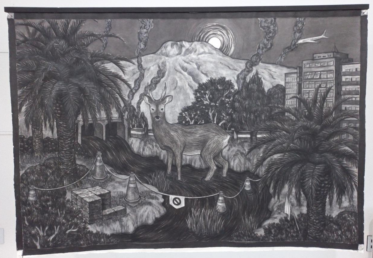 국제자유도시의 곶자왈은 비행기에서 쉬이 내려다보이는 곳에 자리하며 개발 지역의 한가운데에 위치합니다. 그 안에서 갈 곳 없는 사슴 한 마리만 눈을 번뜩이며 우리를 쏘아봅니다. 어떤 감정을 표현하고 있는지는 알 수 없지만, 사슴의 유난히 하얀 눈두덩이는 높은 한라산과 그 뒤에 솟아오른 태양의 색을 닮았습니다. 철저하게 격리되고 이용되어도 화폭에서 유일하게 생명력을 발화하는 주체임을 증명합니다. 사슴의 발은 당장 갈 곳을 잃었지만, 머지않아 어딘가로 껑충 뛰어올라 여전히 살아있음을 똑똑히 보일 것입니다.