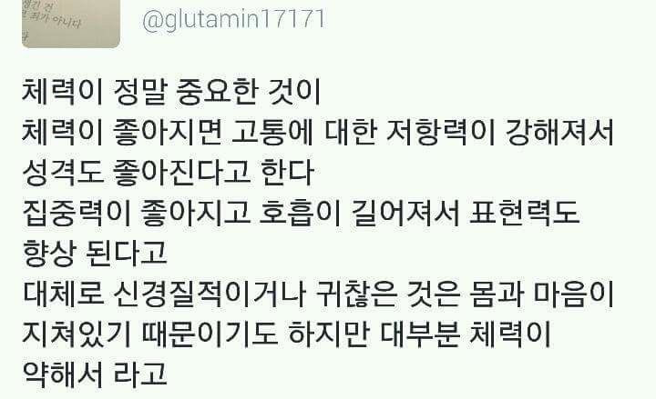 이것과 비슷한 맥락으로 체력에 관한 이야기도 있다. 나는 glutamin17171님의 트윗 멘션에 전적으로 공감한다. 그 내용은 이렇다. ‘체력이 정말 중요한 것이 체력이 좋아지면 고통에 대한 저항력이 강해져서 성격도 좋아진다고 한다. 집중력이 좋아지고 호흡이 길어져서 표현력도 향상된다고. 대체로 신경질적이거나 귀찮은 것은 몸과 마음이 지쳐있기 때문이기도 하지만 대부분 체력이 약해서라고.’