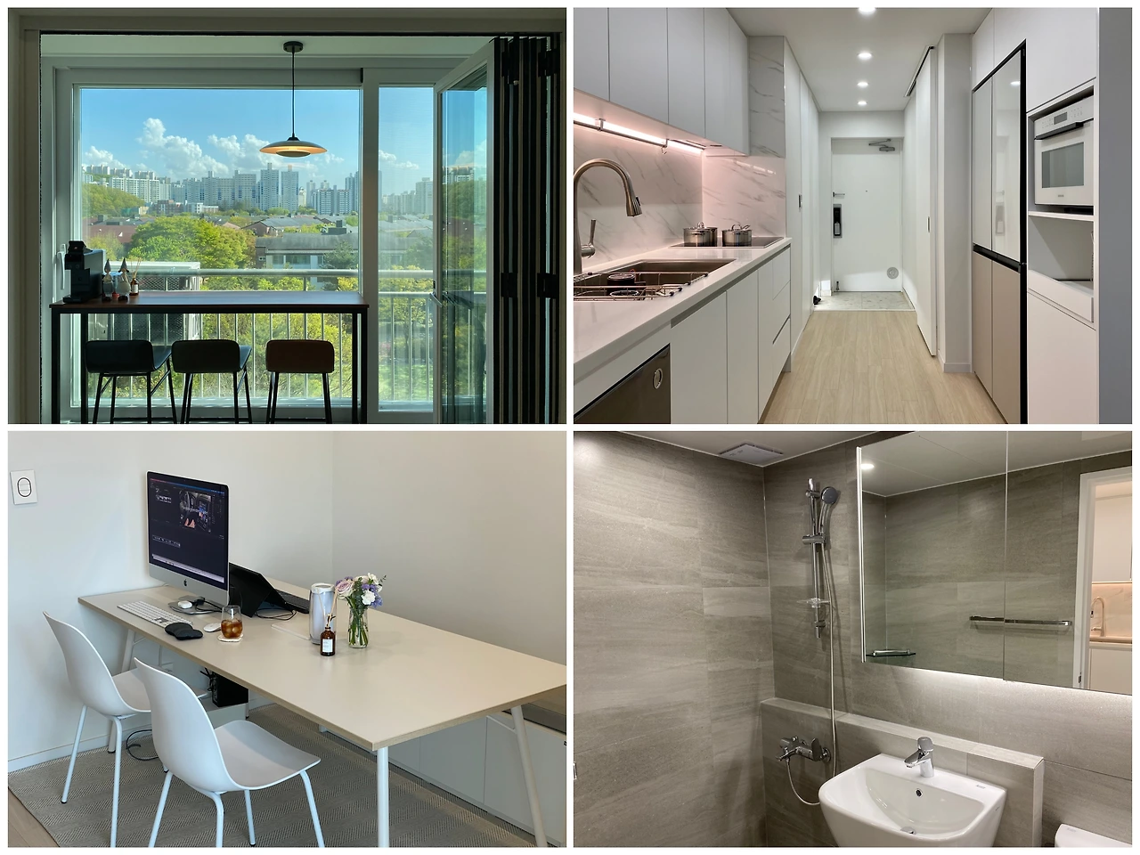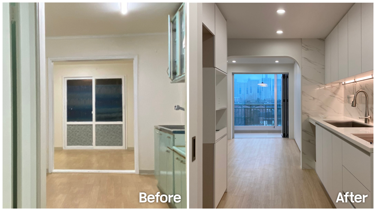 그렇게 우리만의 집이 생겼다. 두 번의 예상치 못한 아픔을 만회하기 위해 인테리어만큼은 주도적으로 이끌어 가고 싶었다. 우리는 직접 인테리어를 공부했고, 모든 공정을 꼼꼼히 관리했다. 30년간 한 번도 고치지 않은 듯해 보이는 옥색의 싱크대와 낡은 알루미늄 새시, 좁은 집을 더 답답하게 만들던 거실 문을 포함하여 모든 것들을 철거했다. 전망이 좋던 발코니는 거실과 단차를 맞춰 홈카페로 꾸미고, 폴딩도어를 달았다. 맞춤 가구로 부족한 수납공간을 채우고, 작은 창고는 화장대로 개조했다. 거실로 통하는 벽은 개방감을 주기 위해 철거하고 싶었지만, 내력벽이라 불가능했다. 대신 아치 스타일로 만들어 디자인적인 요소를 가미했다. 싱크대 벽부터 욕실까지, 모든 타일은 최대한 크기를 키워 개방감을 주었다. 벽지와 필름지는 모두 화이트로 통일해 밝고 따뜻한 분위기를 완성했다. 그렇게, 낡고 좁았던 열다섯 평의 작은 아파트는 볕이 잘 들고, 전망이 좋은 아늑한 공간으로 다시 태어났다.