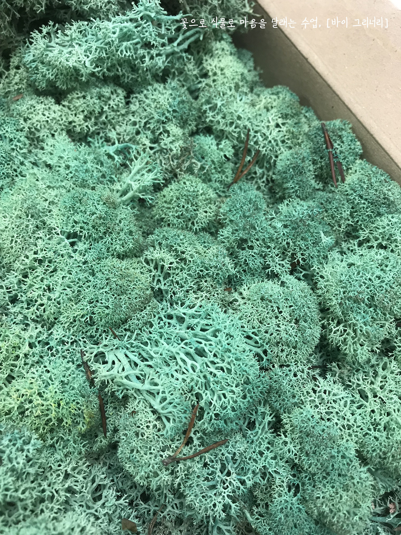 오늘은 낯설기도 하지만 왠지 몽실몽실 만지고 싶은 '스칸디아 모스'를 이용해서 수업을 진행하기로 했답니다. 순록의 먹이이기도 한 스칸디아 모스는 북유럽 스칸디나비아 반도의 숲이나 산과 같은 자연에서 손으로 직접 채취한 순수 천연 이끼입니다. 이를 가공 및 염색 과정을 통해서 다양한 컬러로 만들어 반영구적으로 이용할 수 있도록 만든 것인데요. 습도 확인, 방음. 탈취의 효과가 있다고도 알려져 있지요. 다만 양은 아주 많아야 해요, 허허허. 저는 다양한 스칸디아 모스의 효과도 좋지만, 특유의 촉감과 아이들이 쉽게 다룰 수 있다는 점, 자연의 일부를 수업에 이용한 과정에 집중해봤어요.