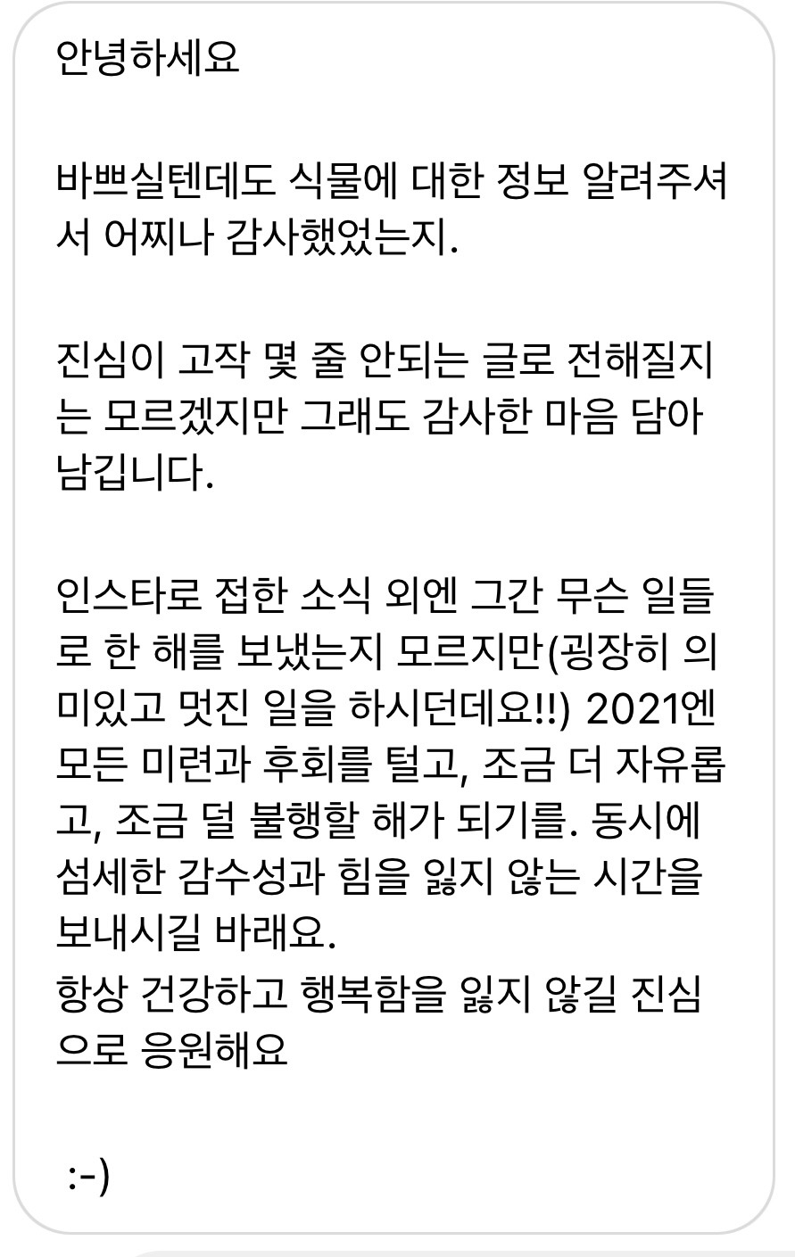 가끔 밀려오는 온라인 식물 상담에 지칠 때도 있지만, 영상이 식물 생활에 도움이 되었다는 댓글을 달아주시는 분들, 답변을 안 해줄 줄 알았는데 해줘서 고맙다는 DM 등이 나에겐 얼마나 큰 힘이 되는지 모른다.