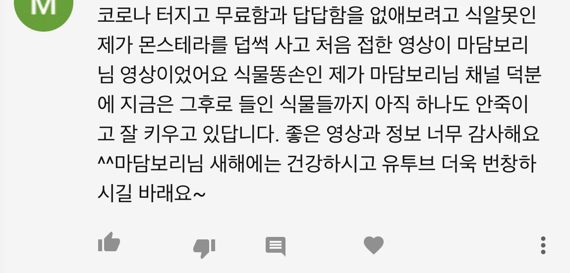 제대로 유튜브를 시작하고 2019년 11월에 올린 영상에도 여전히 이런 류의 식물 상태를 질문하는 댓글이 달리곤 한다. 그래도 최근에는 식물 상담을 진행할 수 있는 곳이 많이 생겼지만, 여전히 많은 사람들이 식물에 대해 궁금한 것이 생기면 어디에 물어봐야 할지 답답한 경우가 많은 듯하다. 나 역시 받은 질문들 중에 모르겠는 것들은 어디에 물어봐야 할지 막막한 걸 보면, 이 댓글을 다시는 분들은 얼마나 얼마나 답답했을까 하는 생각도 든다. 댓글의 길이를 보면 그 간절함마저 느껴진다.