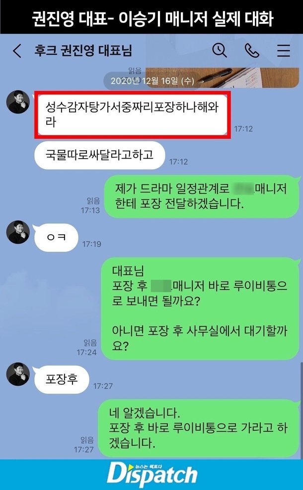이승기 소속사 대표의 갑질이라고 올라온 카톡에 등장한 그 감자탕.