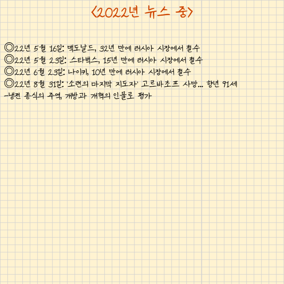 다시 제국이 제국을 짓누르고 다시 인격체가 인격체를 죽인다. 평화는 끝났고 세상은 조각났다. 미국 편과 러시아 편으로. 러시아에서 서구 자본주의 상징들이 빠져나갔다. 맥도날드, 스타벅스, 그리고 나이키까지. 대신 러시아에 맥도날드 비스름한 게, 스타벅스 비스름한 게 생겨났다. 영원히 군림할 것 같던 자본주의의 상징들이 순식간에 끝났다.
