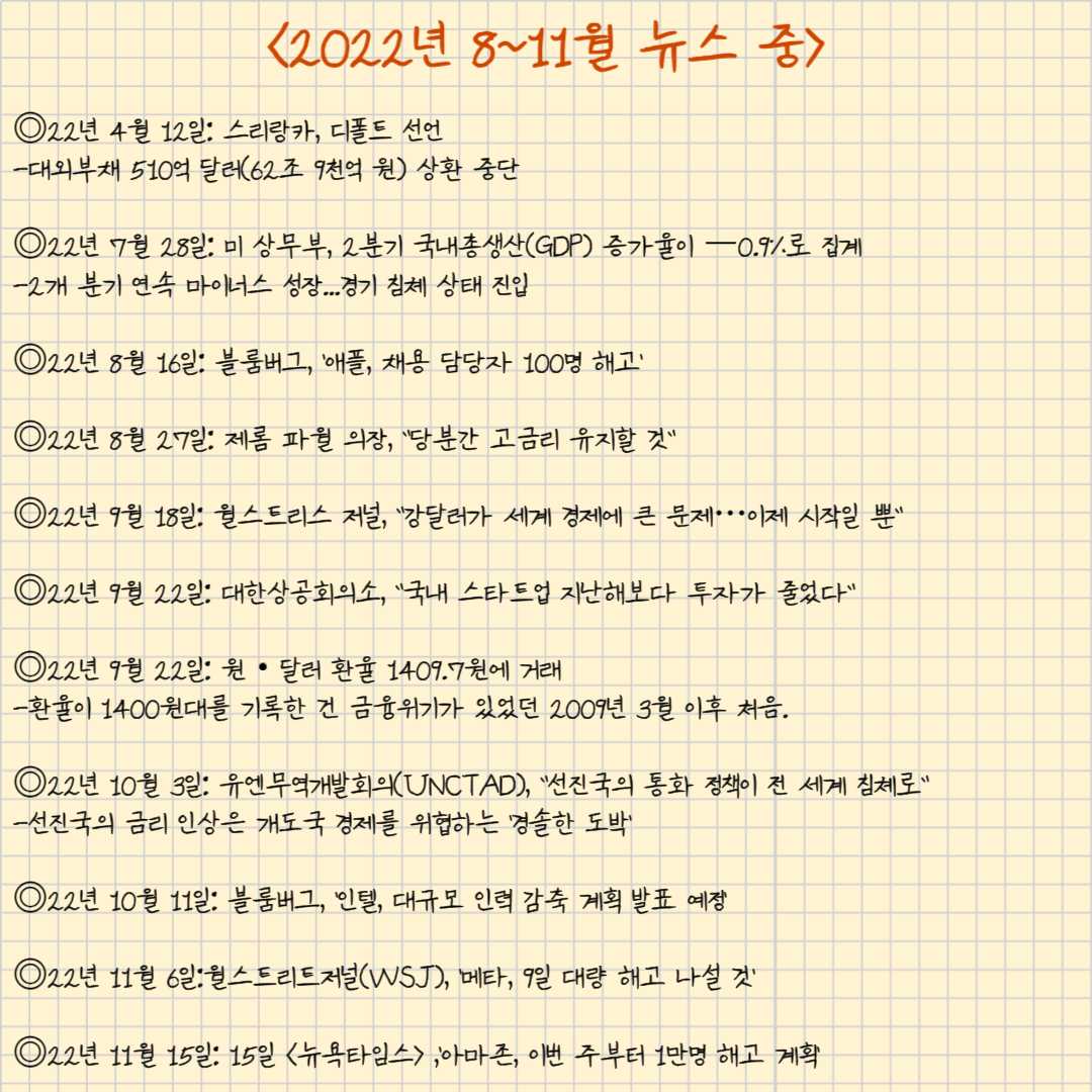 나는 운이 좋았다. 22년 1월에 모든 걸 정리하고 현금화했다. 물론 이렇게까지 박살날 줄은 몰랐다. 기회가 오고 있다고 느꼈다. 부자는 자산 가격이 상승할 때가 아니라 자산이 폭락할 때 탄생한다. 싸게 사느냐 못 사느냐가 부의 차이를 만든다. 1950년 이후 미국은 11번의 침체를 겪었다. 침체 시기에 미국 증시는 평균적으로 32% 떨어졌다. 32%는 평균이다. 어떤 건 ‘반’ 토막이 나고 어떤 건 ‘세’ 토막이 났다. 그래서 어차피 이렇게 된 거 모든 게 폭삭 망하고 연준이 금리를 내리길 내심 바랐다.