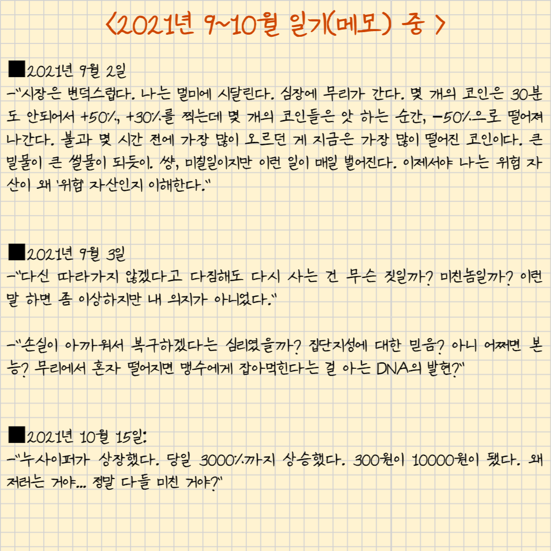 차트를 머리가 아니라 눈으로만 봤다. 내 눈에 급등하는 차트는 항상 자극적이었다. 그래서 계속 따라갔다. 집단지성에 대한 믿음이었을까? 다수가 되면 묘한 안전함을 느꼈다. 물론 다짐도 해봤다. 다시는 급등하는 차트를 따라가지 않겠다고. 그런데, 그런데, 그런데 귀신에 씐 것처럼 다시 손을 댔다. 결국 자기혐오만 가득한 자책과 손실을 만회하겠다는 분노만 남았다.