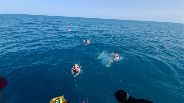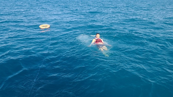 호수 중앙으로 한 참을 달린 배가 멈추더니 뱃머리에서 직원으로 보이는 청년이 나타나 우리에게 구명조끼를 입혔다. 다들 망설이는데 내가 제일 먼저 호수의 투명함 속으로 뛰어들었다. 호수의 청량한 쾌감이 정수리를 거쳐 온몸으로 파고들었다. 바람이 불어 날씨가 조금 쌀쌀했는데 물속에 들어가니 따뜻한 느낌이 들었다. '아 이래서 열해(熱海)라고(중국 사서) 소개되어 있었구나.'
