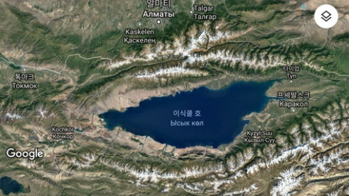 이식쿨(Issyk Kul) 호수는 키르기스어로 '따듯한 호수'라는 뜻으로 추운 겨울에도 얼지 않는 호수로 유명하다. 크기가 우리나라 경상북도 정도로 세계에서 티티카카 호수 다음으로 큰 산정 호수이다. 무려 해발 1600m에 있는 호수라고 하니 '하늘 위에 호수'라는 말이 딱 어울린다. 이식쿨 호수는 가로 182km, 세로 60km, 깊이 702m에 이르며 우주에서 보면 마치 눈처럼 생겼다고 해 '지구의 눈'이라고 부른다고 한다.