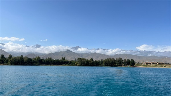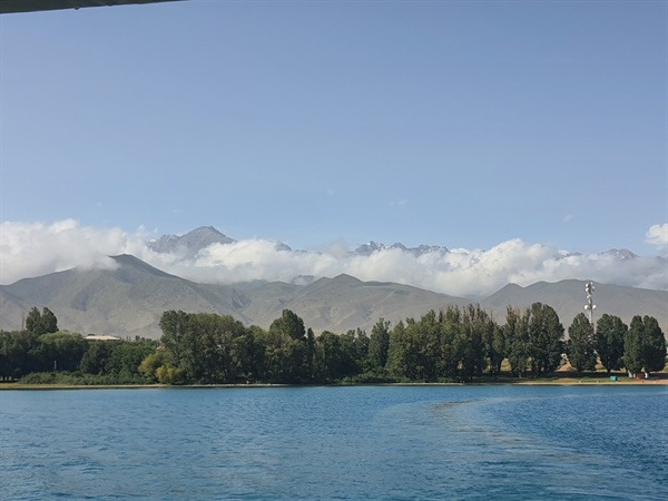 우리는 이곳에서 배를 타고 호수 한가운데로 들어가 수영 체험을 하는 호사를 누렸다. 배를 타고 호수 중앙으로 나가는 동안 눈에 든 풍광이 현실감을 빼앗았다. 바다 같은 잔잔한 호수와 그 뒷 배경으로 펼쳐진 눈 덮인 텐산산맥이 마치 동화 속 나라 같았다.