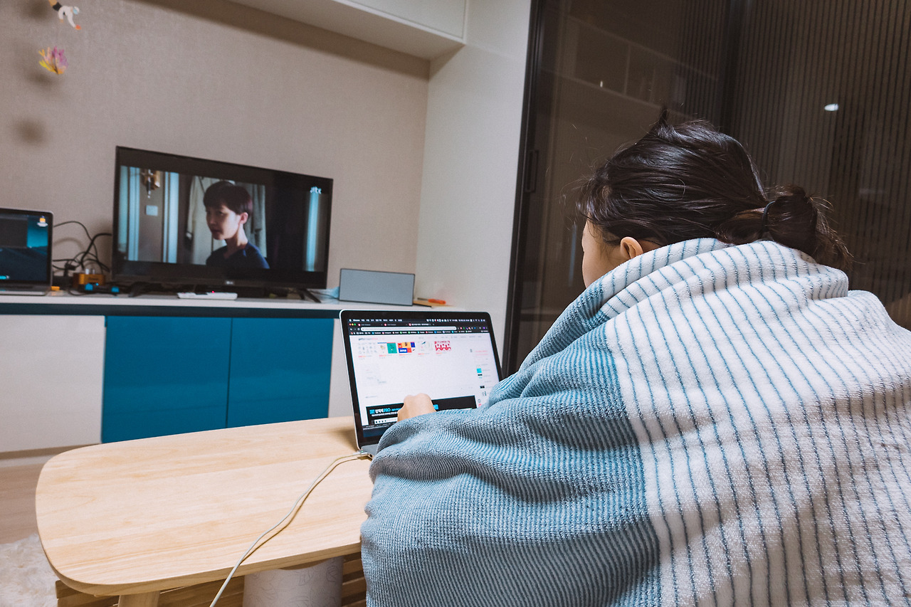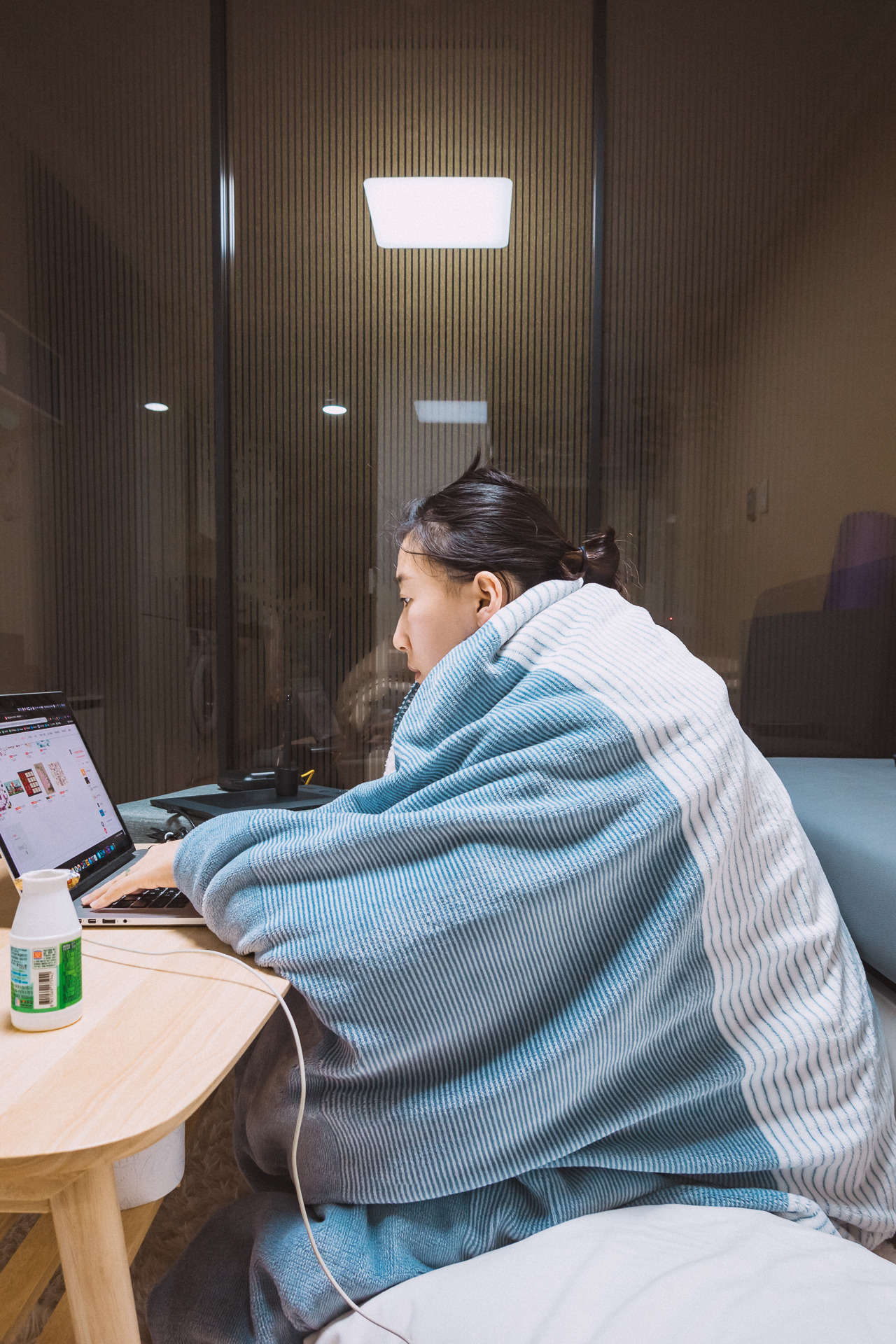 제주에는 밤늦게 까지 하는 카페가 많지 않기에, 밤에는 대부분 숙소에서 일했다. 숙소의 단열 상태를 보여주는 유하연 사장님의 작업 모습.