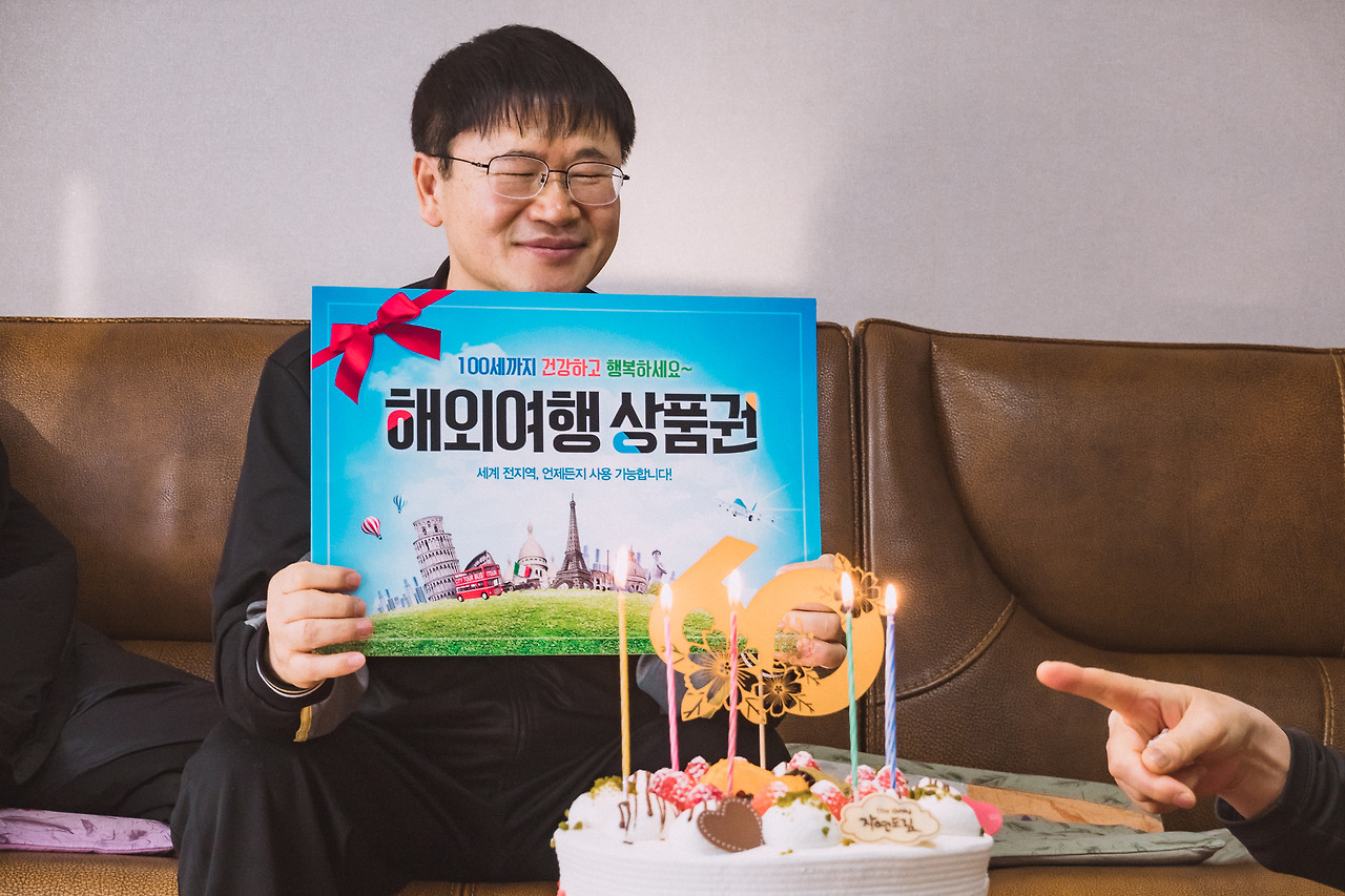 다음날 아침, 가족끼리 축하파티를 했다. 다음 주에 여행을 갈 테니 생일은 조촐하게 보내자는 부모님의 말씀이 있었지만, 이미 전주를 오네 마네 하면서 한번 맘고생이 있었기에 빈손으로 가기 뭐했다. 하연이가 제주에서 미리 주문해둔 '해외여행 상품권' 피켓과 현수막, 토퍼 등이 제 몫을 톡톡히 했다. 이런 기념일 챙기는 일에 멍청한 남편 때문에 하연이가 매번 고생이다.
