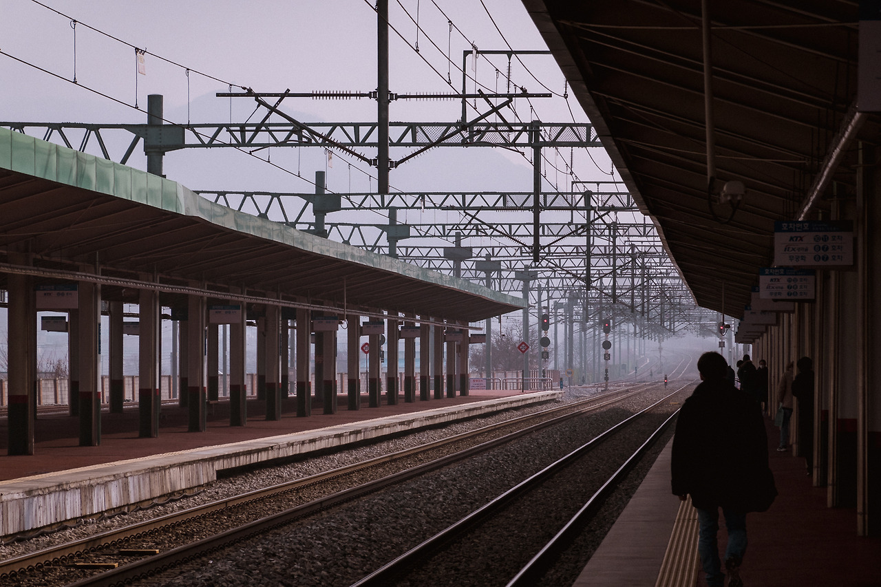 하연이가 좋아하는 전주 대표음식 중 하나인 풍년제과 초코파이. 다른 지점에 들를 여유가 없었기에, 역에 있는 매장에서나마 아쉬움을 달랬다. 기차를 기다리며 바라본 풍경. 길게 늘어선 철로와 시설물들이 미세먼지에 덮여, 마치 SF에 속 미래도시 속에 있는 것만 같았다.