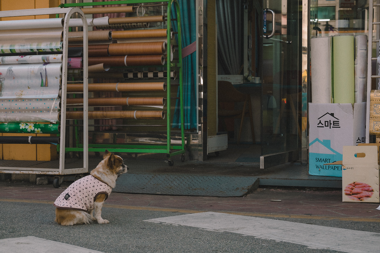 상점 안에 들어간 주인을 기다리던 강아지. 고놈 참 영리하군.