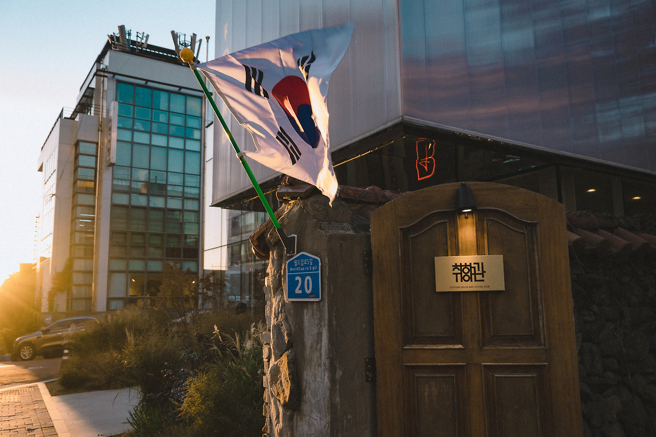 입구에 태극기가 너무 오래 걸려있어서(체감 한 달 넘게 걸려있었던 느낌), 안주인들에게 물어봤더니 취향관에서 걸어둔 게 아니라고. 해 질 녘이라 뭔가 괜히 비장한 분위기네.