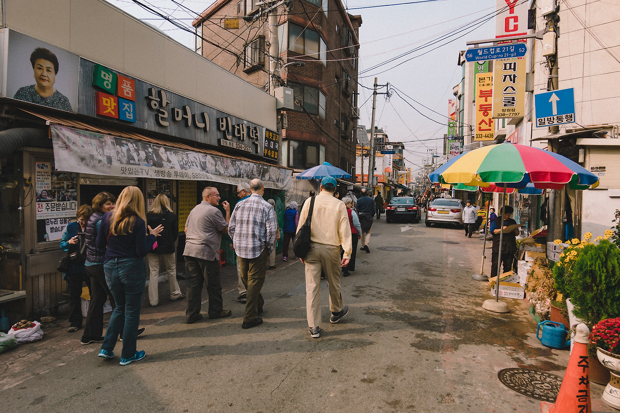 망원시장에서 외국인 관광객을 보는 건 흔한 일이지만, 보통은 자판기 앞에서 인증샷을 찍는 젊은 아시아 계열의 친구들이 주였다. 요때쯤 단체관광객들이 눈에 띄기 시작했는데, 연령이나 국적면에서 이전과는 조금 다른 게 신기했다.