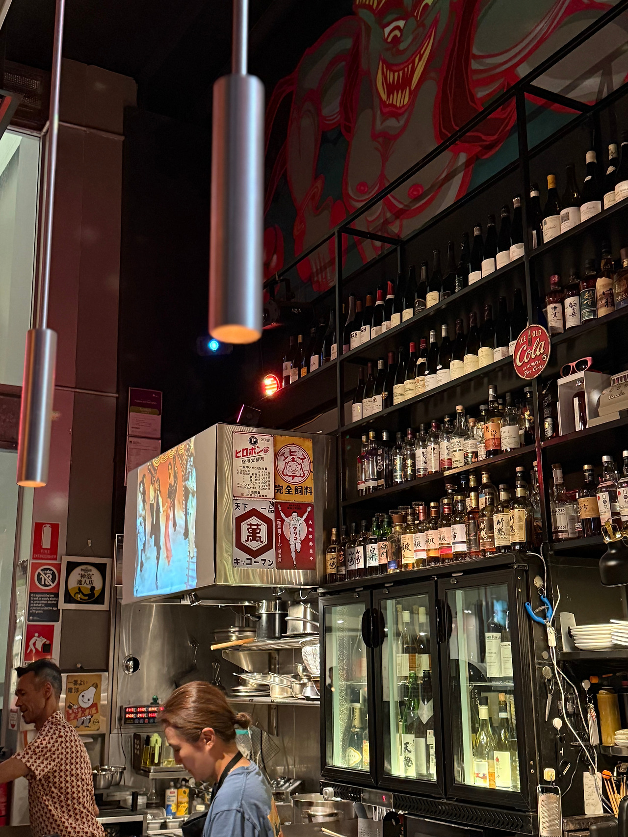 일본인 부부가 운영하는 그곳은 높은 층고에 와인과 사케병이 인테리어 자체가 되고