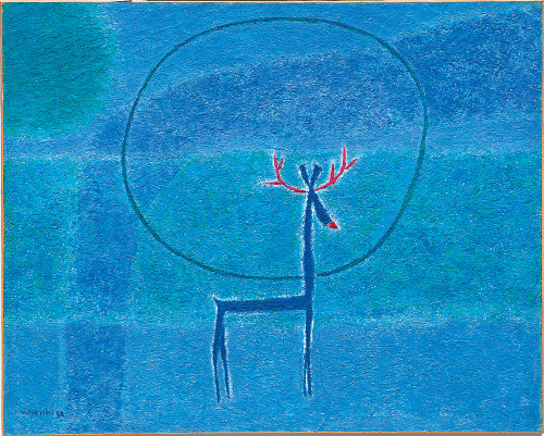 사슴의 뿔과 코에만 포인트로 찍혀있는 빨간색과 대비되어, 몇 겹으로 칠해졌는지 짐작할 수 없는, 깊이 있는 푸른색이 가져다주는 분위기는 말로 설명할 수 있는 종류가 아니었다. 이 그림을 보고 내가 느낀 감정은 충격에 가장 근접할 것이다.