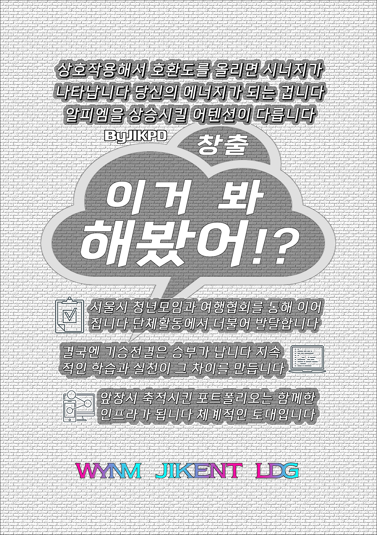 이 거봐, 해봤어!? 책표지를 공감해 보세요! 상호작용해서 호환도를 올리면 시너지가 나타납니다 당신의 에너지가 되는 겁니다 알피엠을 상승시킬 어텐션이 다릅니다 서울시 청년모임과 여행협회를 통해 이어집니다 단체활동에서 더불어 발달합니다 결국엔 기승전결은 승부가 납니다 지속적인 학습과 실천이 그 차이를 만듭니다 앞장서 축적시킨 포트폴리오는 함께한 인프라가 됩니다 체계적인 토대입니다