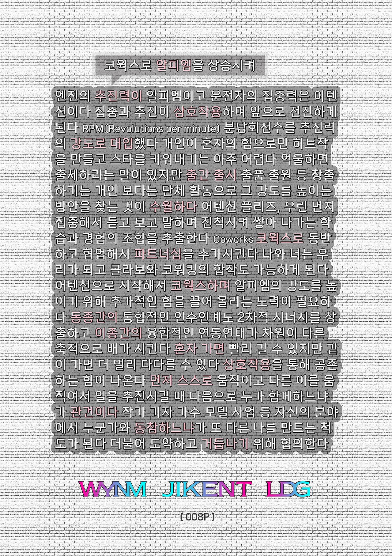 엔진의 추진력이 알피엠이고 운전자의 집중력은 어텐션이다 집중과 추진이 상호작용하며 앞으로 전진하게 된다 RPM(Revolutions per minute) 분당회전수를 추진력의 강도로 대입했다 개인이 혼자의 힘으로만 히트작을 만들고 스타를 키워내기는 아주 어렵다 억울하면 출세하라는 말이 있지만 출간 출시 출품 출원 등 창출하기는 개인 보다는 단체 활동으로 그 강도를 높이는 방안을 찾는 것이 수월하다 어텐션 플리즈, 우린 먼저 집중해서 듣고 보고 말하며 진척시켜 쌓아 나가는 학습과 경험의 조합을 추출한다 Coworks 코웍스로 동반하고 협업해서 파트너십을 추가시킨다 나와 너는 우리가 되고 콜라보와 코워킹의 합작도 가능하게 된다 어텐션으로 시작해서 코웍스하며 알피엠의 강도를 높이기 위해 추가적인 힘을 끌어 올리는 노력이 필요하다 동종간의 통합적인 인수인계도 2차적 시너지를 창출하고 이종간의 융합적인 연동연대가 차원이 다른 축적으로 배가 시킨다 혼자 가면 빨리 갈 수 있지만 같이 가면 더 멀리 다다를 수 있다 상호작용을 통해 공존하는 힘이 나온다 먼저 스스로 움직이고 다른 이를 움직여서 일을 추진시킬 때 다음으로 누가 함께하느냐가 관건이다 작가 기자 가수 모델 사업 등 자신의 분야에서 누군가와 동참하느냐가 또 다른 나를 만드는 척도가 된다 더불어 도약하고 거듭나기 위해 협의한다