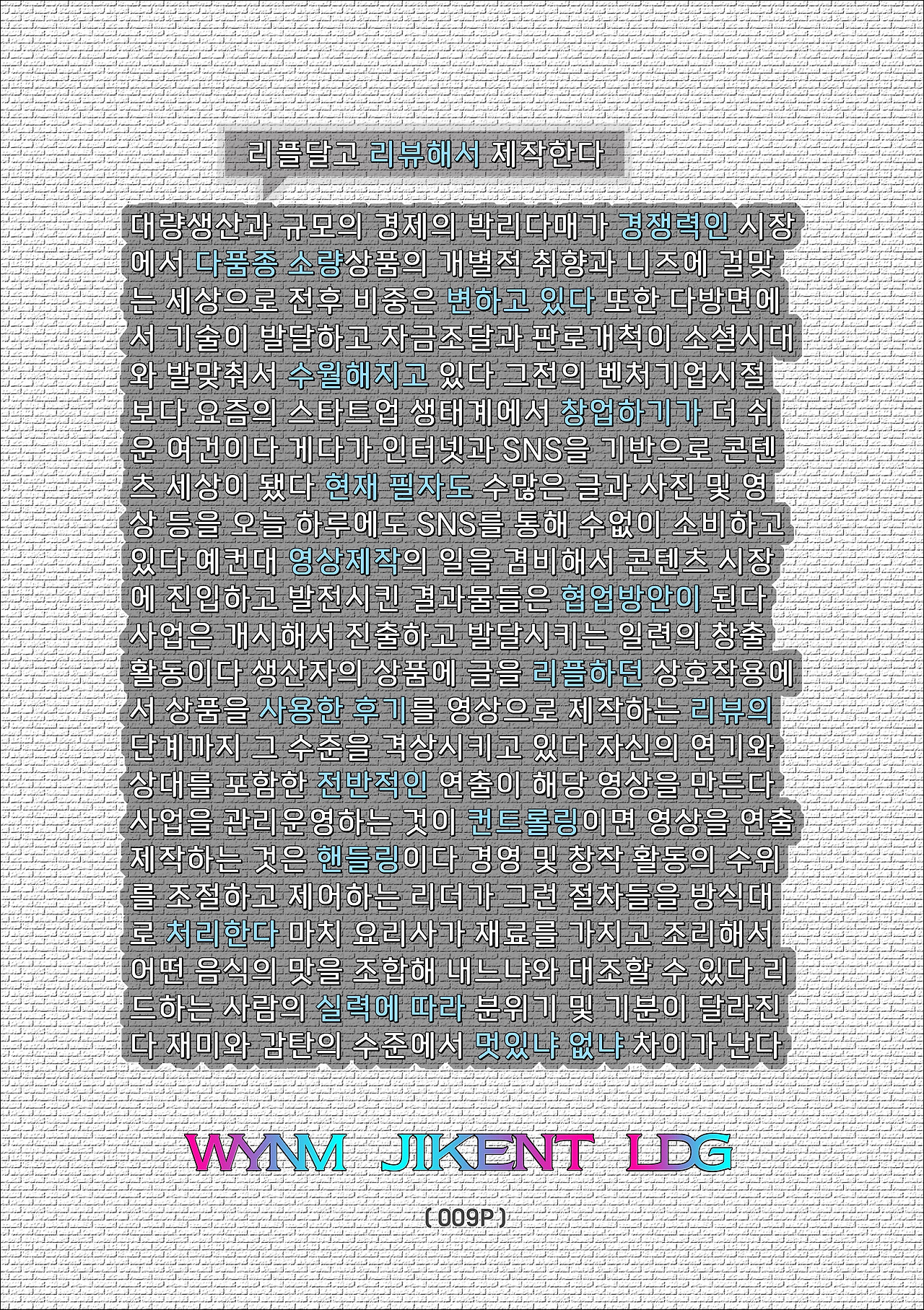 대량생산과 규모의 경제의 박리다매가 경쟁력인 시장에서 다품종 소량상품의 개별적 취향과 니즈에 걸맞는 세상으로 전후 비중은 변하고 있다 또한 다방면에서 기술이 발달하고 자금조달과 판로개척이 소셜시대와 발맞춰서 수월해지고 있다 그전의 벤처기업시절보다 요즘의 스타트업 생태계에서 창업하기가 더 쉬운 여건이다 게다가 인터넷과 SNS을 기반으로 콘텐츠 세상이 됐다 현재 필자도 수많은 글과 사진 및 영상 등을 오늘 하루에도 SNS를 통해 수없이 소비하고 있다 예컨대 영상제작의 일을 겸비해서 콘텐츠 시장에 진입하고 발전시킨 결과물들은 협업방안이 된다 사업은 개시해서 진출하고 발달시키는 일련의 창출활동이다 생산자의 상품에 글을 리플하던 상호작용에서 상품을 사용한 후기를 영상으로 제작하는 리뷰의 단계까지 그 수준을 격상시키고 있다 자신의 연기와 상대를 포함한 전반적인 연출이 해당 영상을 만든다 사업을 관리운영하는 것이 컨트롤링이면 영상을 연출제작하는 것은 핸들링이다 경영 및 창작 활동의 수위를 조절하고 제어하는 리더가 그런 절차들을 방식대로 처리한다 마치 요리사가 재료를 가지고 조리해서 어떤 음식의 맛을 조합해 내느냐와 대조할 수 있다 리드하는 사람의 실력에 따라 분위기 및 기분이 달라진다 재미와 감탄의 수준에서 멋있냐 없냐 차이가 난다