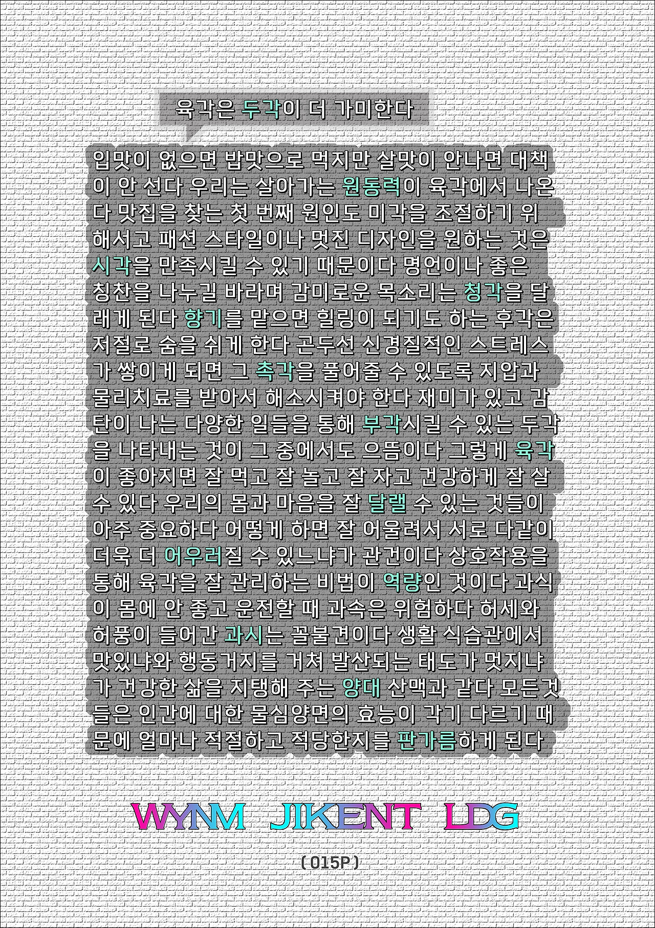 입맛이 없으면 밥맛으로 먹지만 살맛이 안나면 대책이 안 선다 우리는 살아가는 원동력이 육각에서 나온다 맛집을 찾는 첫 번째 원인도 미각을 조절하기 위해서고 패션 스타일이나 멋진 디자인을 원하는 것은 시각을 만족시킬 수 있기 때문이다 명언이나 좋은 칭찬을 나누길 바라며 감미로운 목소리는 청각을 달래게 된다 향기를 맡으면 힐링이 되기도 하는 후각은 저절로 숨을 쉬게 한다 곤두선 신경질적인 스트레스가 쌓이게 되면 그 촉각을 풀어줄 수 있도록 지압과 물리치료를 받아서 해소시켜야 한다 재미가 있고 감탄이 나는 다양한 일들을 통해 부각시킬 수 있는 두각을 나타내는 것이 그 중에서도 으뜸이다 그렇게 육각이 좋아지면 잘 먹고 잘 놀고 잘 자고 건강하게 잘 살 수 있다 우리의 몸과 마음을 잘 달랠 수 있는 것들이 아주 중요하다 어떻게 하면 잘 어울려서 서로 다같이 더욱 더 어우러질 수 있느냐가 관건이다 상호작용을 통해 육각을 잘 관리하는 비법이 역량인 것이다 과식이 몸에 안 좋고 운전할 때 과속은 위험하다 허세와 허풍이 들어간 과시는 꼴불견이다 생활 식습관에서 맛있냐와 행동거지를 거쳐 발산되는 태도가 멋지냐가 건강한 삶을 지탱해 주는 양대 산맥과 같다 모든것들은 인간에 대한 물심양면의 효능이 각기 다르기 때문에 얼마나 적절하고 적당한지를 판가름하게 된다