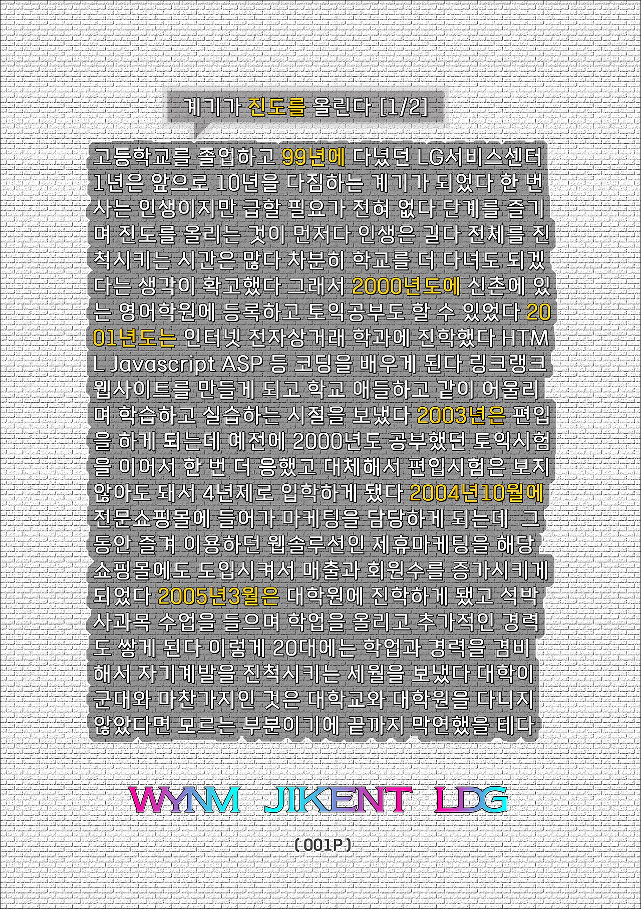 고등학교를 졸업하고 99년에 다녔던 LG서비스센터1년은 앞으로 10년을 다짐하는 계기가 되었다 한 번 사는 인생이지만 급할 필요가 전혀 없다 단계를 즐기며 진도를 올리는 것이 먼저다 인생은 길다 전체를 진척시키는 시간은 많다 차분히 학교를 더 다녀도 되겠다는 생각이 확고했다 그래서 2000년도에 신촌에 있는 영어학원에 등록하고 토익공부도 할 수 있었다 2001년도는 인터넷 전자상거래 학과에 진학했다 HTML Javascript ASP 등 코딩을 배우게 된다 링크랭크 웹사이트를 만들게 되고 학교 애들하고 같이 어울리며 학습하고 실습하는 시절을 보냈다 2003년은 편입을 하게 되는데 예전에 2000년도 공부했던 토익시험을 이어서 한 번 더 응했고 대체해서 편입시험은 보지않아도 돼서 4년제로 입학하게 됐다 2004년10월에전문쇼핑몰에 들어가 마케팅을 담당하게 되는데 그동안 즐겨 이용하던 웹솔루션인 제휴마케팅을 해당쇼핑몰에도 도입시켜서 매출과 회원수를 증가시키게되었다 2005년3월은 대학원에 진학하게 됐고 석박사과목 수업을 들으며 학업을 올리고 추가적인 경력도 쌓게 된다 이렇게 20대에는 학업과 경력을 겸비해서 자기계발을 진척시키는 세월을 보냈다 대학이군대와 마찬가지인 것은 대학교와 대학원을 다니지않았다면 모르는 부분이기에 끝까지 막연했을 테다