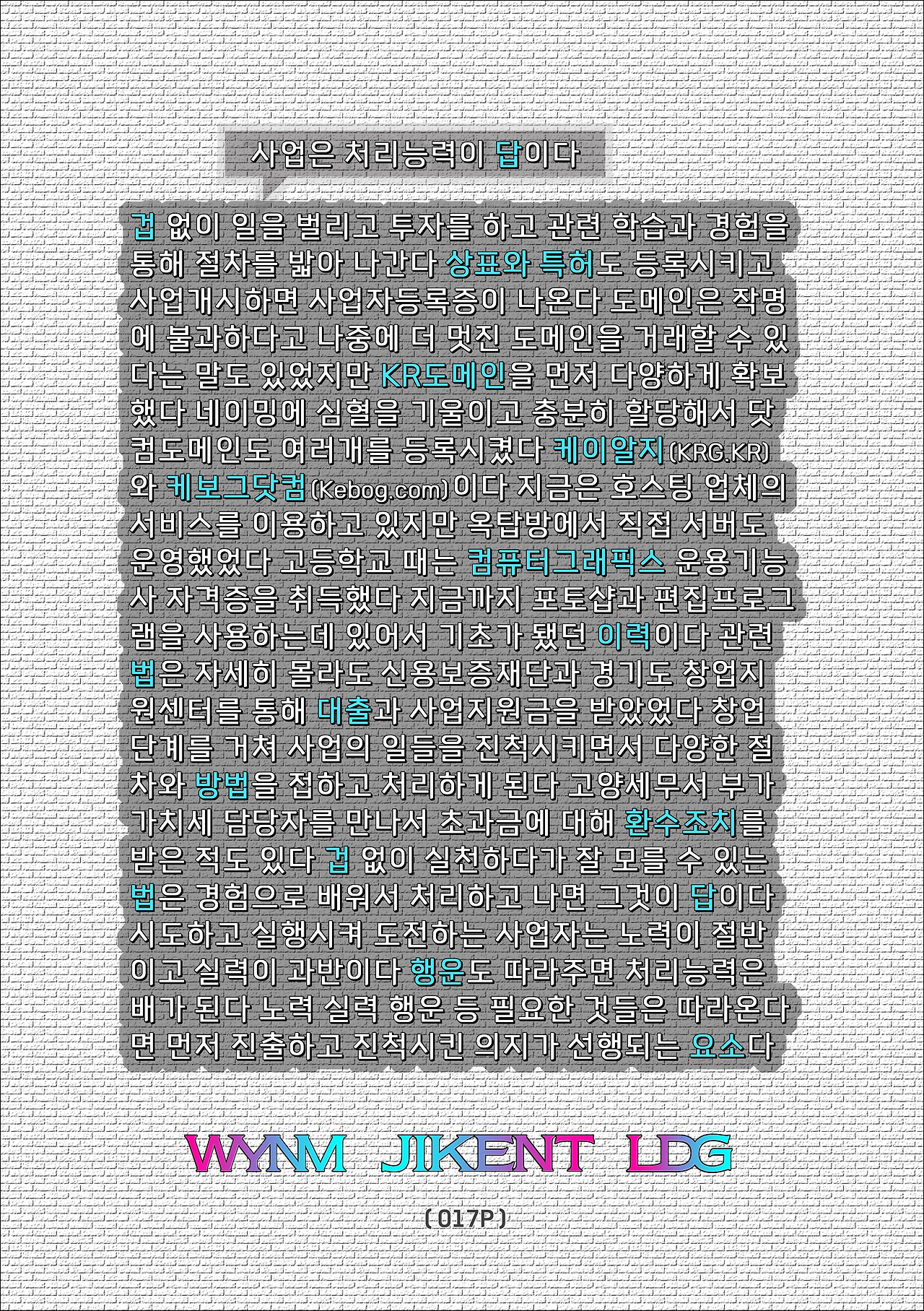 겁 없이 일을 벌리고 투자를 하고 관련 학습과 경험을통해 절차를 밟아 나간다 상표와 특허도 등록시키고사업개시하면 사업자등록증이 나온다 도메인은 작명에 불과하다고 나중에 더 멋진 도메인을 거래할 수 있다는 말도 있었지만 KR도메인을 먼저 다양하게 확보했다 네이밍에 심혈을 기울이고 충분히 할당해서 닷컴도메인도 여러개를 등록시켰다 케이알지(KRG.KR)와 케보그닷컴(Kebog.com)이다 지금은 호스팅 업체의서비스를 이용하고 있지만 옥탑방에서 직접 서버도운영했었다 고등학교 때는 컴퓨터그래픽스 운용기능사 자격증을 취득했다 지금까지 포토샵과 편집프로그램을 사용하는데 있어서 기초가 됐던 이력이다 관련법은 자세히 몰라도 신용보증재단과 경기도 창업지원센터를 통해 대출과 사업지원금을 받았었다 창업단계를 거쳐 사업의 일들을 진척시키면서 다양한 절차와 방법을 접하고 처리하게 된다 고양세무서 부가가치세 담당자를 만나서 초과금에 대해 환수조치를받은 적도 있다 겁 없이 실천하다가 잘 모를 수 있는법은 경험으로 배워서 처리하고 나면 그것이 답이다시도하고 실행시켜 도전하는 사업자는 노력이 절반이고 실력이 과반이다 행운도 따라주면 처리능력은배가 된다 노력 실력 행운 등 필요한 것들은 따라온다면 먼저 진출하고 진척시킨 의지가 선행되는 요소다