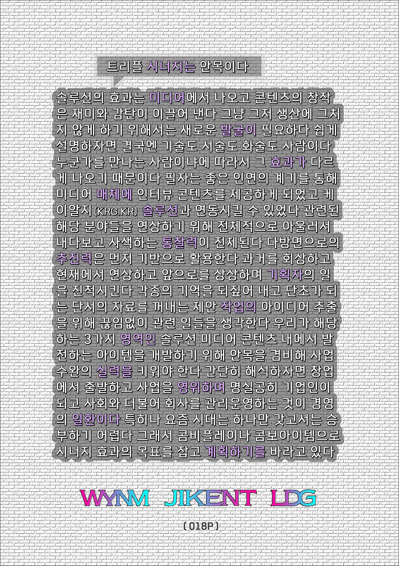 솔루션의 효과는 미디어에서 나오고 콘텐츠의 창작은 재미와 감탄이 이끌어 낸다 그냥 그저 생산에 그치지 않게 하기 위해서는 새로운 발굴이 필요하다 쉽게설명하자면 결국엔 기술도 서술도 화술도 사람이다누군가를 만나는 사람이냐에 따라서 그 효과가 다르게 나오기 때문이다 필자는 좋은 인연의 계기를 통해미디어 매체에 인터뷰 콘텐츠를 제공하게 되었고 케이알지(KRG.KR) 솔루션과 연동시킬 수 있었다 관련된해당 분야들을 연상하기 위해 전체적으로 아울러서내다보고 사색하는 통찰력이 전제된다 다방면으로의추진력은 먼저 기반으로 활용한다 과거를 회상하고현재에서 연상하고 앞으로를 상상하며 기획자의 일을 진척시킨다 각종의 기억을 되짚어 내고 단초가 되는 단서의 자료를 꺼내는 제안 작업의 아이디어 추출을 위해 끊임없이 관련 일들을 생각한다 우리가 해당하는 3가지 영역인 솔루션 미디어 콘텐츠 내에서 발전하는 아이템을 개발하기 위해 안목을 겸비해 사업수완의 실력을 키워야 한다 간단히 해석하자면 창업에서 출발하고 사업을 영위하며 명실공히 기업인이되고 사회와 더불어 회사를 관리운영하는 것이 경영의 일환이다 특히나 요즘 시대는 하나만 갖고서는 승부하기 어렵다 그래서 콤비플레이나 콤보아이템으로시너지 효과의 목표를 잡고 계획하기를 바라고 있다