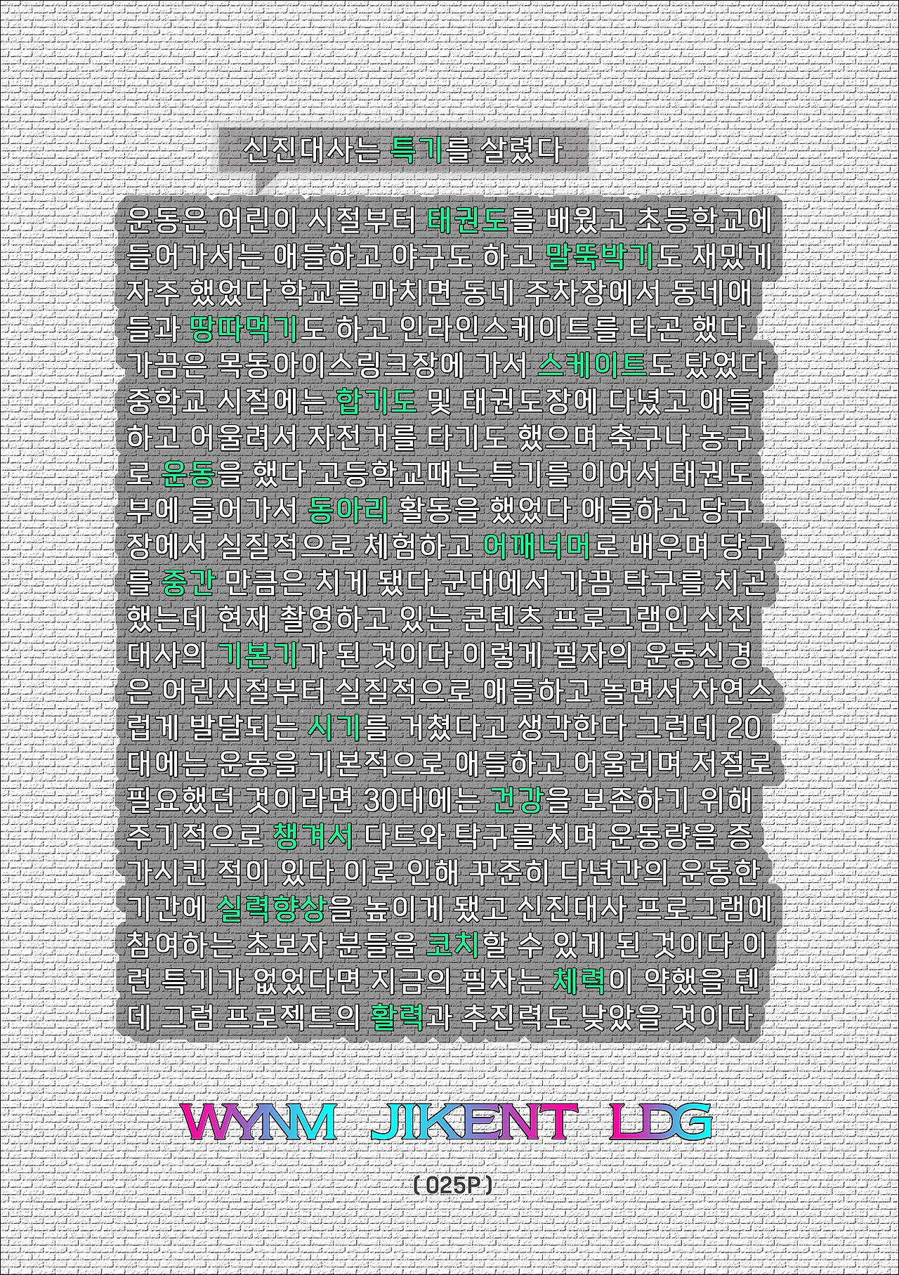 운동은 어린이 시절부터 태권도를 배웠고 초등학교에들어가서는 애들하고 야구도 하고 말뚝박기도 재밌게자주 했었다 학교를 마치면 동네 주차장에서 동네애들과 땅따먹기도 하고 인라인스케이트를 타곤 했다 가끔은 목동아이스링크장에 가서 스케이트도 탔었다중학교 시절에는 합기도 및 태권도장에 다녔고 애들하고 어울려서 자전거를 타기도 했으며 축구나 농구로 운동을 했다 고등학교때는 특기를 이어서 태권도부에 들어가서 동아리 활동을 했었다 애들하고 당구장에서 실질적으로 체험하고 어깨너머로 배우며 당구를 중간 만큼은 치게 됐다 군대에서 가끔 탁구를 치곤했는데 현재 촬영하고 있는 콘텐츠 프로그램인 신진대사의 기본기가 된 것이다 이렇게 필자의 운동신경은 어린시절부터 실질적으로 애들하고 놀면서 자연스럽게 발달되는 시기를 거쳤다고 생각한다 그런데 20대에는 운동을 기본적으로 애들하고 어울리며 저절로필요했던 것이라면 30대에는 건강을 보존하기 위해주기적으로 챙겨서 다트와 탁구를 치며 운동량을 증가시킨 적이 있다 이로 인해 꾸준히 다년간의 운동한기간에 실력향상을 높이게 됐고 신진대사 프로그램에참여하는 초보자 분들을 코치할 수 있게 된 것이다 이런 특기가 없었다면 지금의 필자는 체력이 약했을 텐데 그럼 프로젝트의 활력과 추진력도 낮았을 것이다