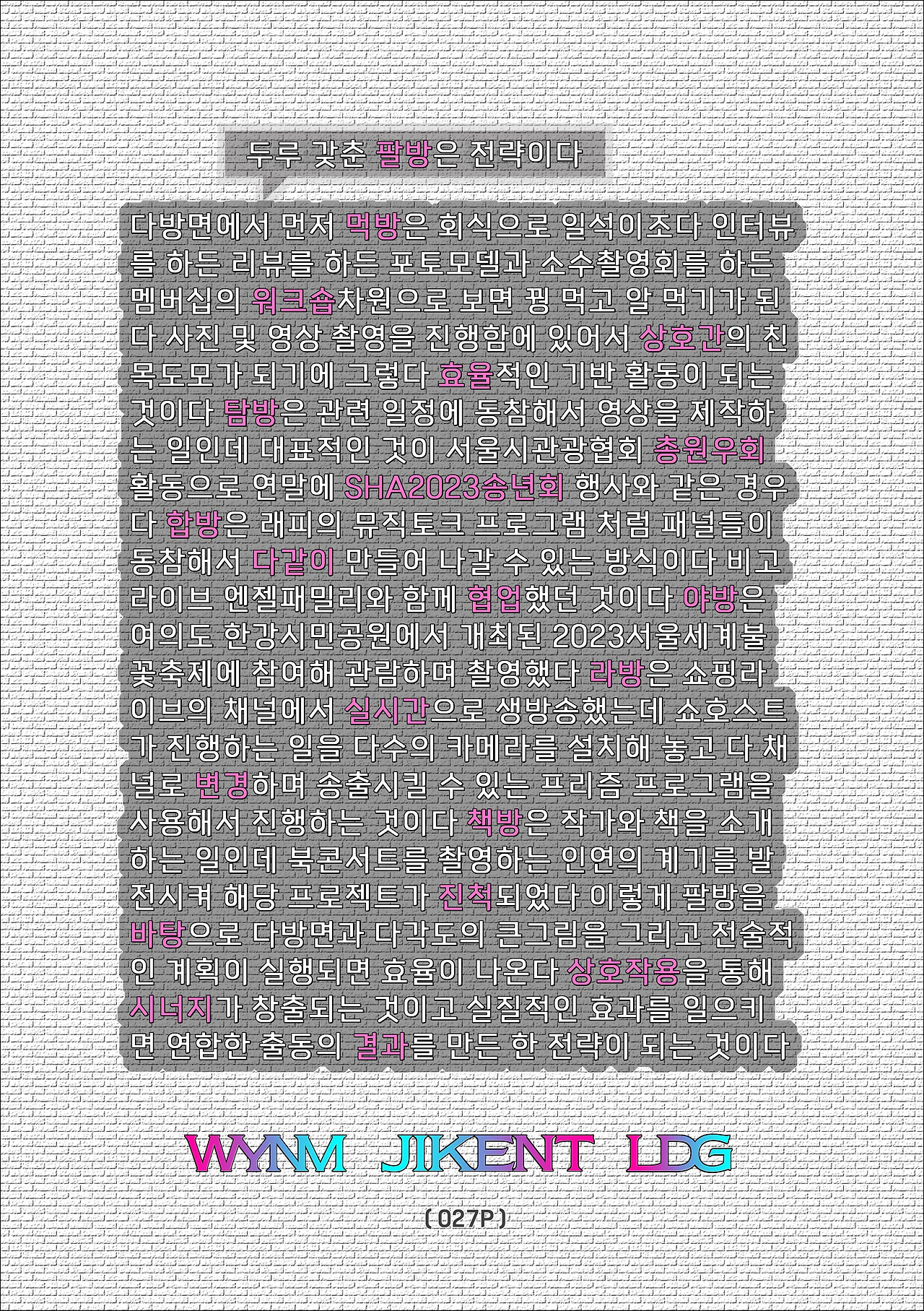 다방면에서 먼저 먹방은 회식으로 일석이조다 인터뷰를 하든 리뷰를 하든 포토모델과 소수촬영회를 하든 멤버십의 워크숍차원으로 보면 꿩 먹고 알 먹기가 된다 사진 및 영상 촬영을 진행함에 있어서 상호간의 친목도모가 되기에 그렇다 효율적인 기반 활동이 되는 것이다 탐방은 관련 일정에 동참해서 영상을 제작하는 일인데 대표적인 것이 서울시관광협회 총원우회활동으로 연말에 SHA2023송년회 행사와 같은 경우다 합방은 래피의 뮤직토크 프로그램 처럼 패널들이 동참해서 다같이 만들어 나갈 수 있는 방식이다 비고라이브 엔젤패밀리와 함께 협업했던 것이다 야방은여의도 한강시민공원에서 개최된 2023서울세계불꽃축제에 참여해 관람하며 촬영했다 라방은 쇼핑라이브의 채널에서 실시간으로 생방송했는데 쇼호스트가 진행하는 일을 다수의 카메라를 설치해 놓고 다 채널로 변경하며 송출시킬 수 있는 프리즘 프로그램을 사용해서 진행하는 것이다 책방은 작가와 책을 소개하는 일인데 북콘서트를 촬영하는 인연의 계기를 발전시켜 해당 프로젝트가 진척되었다 이렇게 팔방을바탕으로 다방면과 다각도의 큰그림을 그리고 전술적인 계획이 실행되면 효율이 나온다 상호작용을 통해 시너지가 창출되는 것이고 실질적인 효과를 일으키면 연합한 출동의 결과를 만든 한 전략이 되는 것이다