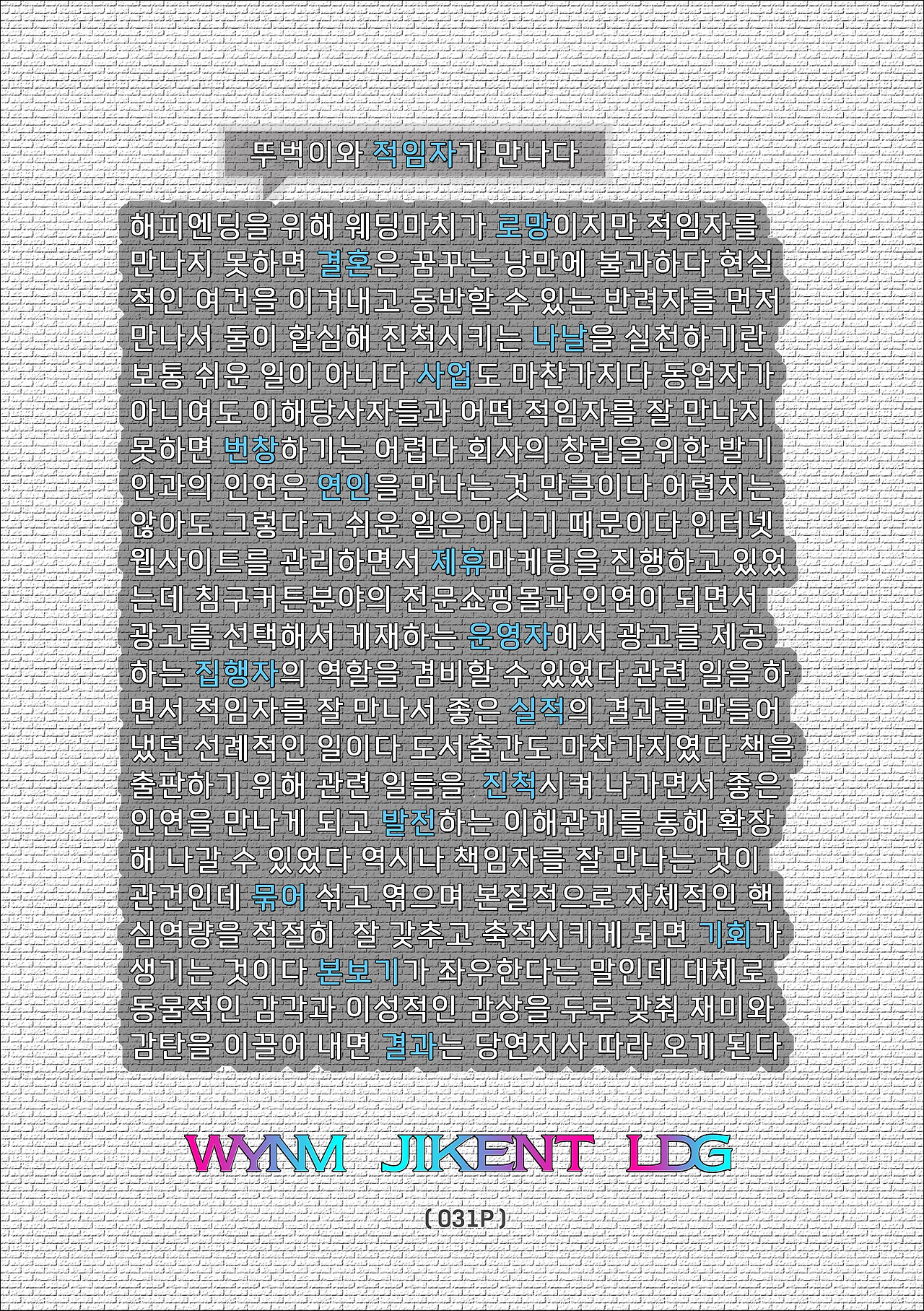 해피엔딩을 위해 웨딩마치가 로망이지만 적임자를만나지 못하면 결혼은 꿈꾸는 낭만에 불과하다 현실적인 여건을 이겨내고 동반할 수 있는 반려자를 먼저만나서 둘이 합심해 진척시키는 나날을 실천하기란보통 쉬운 일이 아니다 사업도 마찬가지다 동업자가아니여도 이해당사자들과 어떤 적임자를 잘 만나지못하면 번창하기는 어렵다 회사의 창립을 위한 발기인과의 인연은 연인을 만나는 것 만큼이나 어렵지는않아도 그렇다고 쉬운 일은 아니기 때문이다 인터넷웹사이트를 관리하면서 제휴마케팅을 진행하고 있었는데 침구커튼분야의 전문쇼핑몰과 인연이 되면서광고를 선택해서 게재하는 운영자에서 광고를 제공하는 집행자의 역할을 겸비할 수 있었다 관련 일을 하면서 적임자를 잘 만나서 좋은 실적의 결과를 만들어냈던 선례적인 일이다 도서출간도 마찬가지였다 책을출판하기 위해 관련 일들을 진척시켜 나가면서 좋은인연을 만나게 되고 발전하는 이해관계를 통해 확장해 나갈 수 있었다 역시나 책임자를 잘 만나는 것이관건인데 묶어 섞고 엮으며 본질적으로 자체적인 핵심역량을 적절히 잘 갖추고 축적시키게 되면 기회가생기는 것이다 본보기가 좌우한다는 말인데 대체로동물적인 감각과 이성적인 감상을 두루 갖춰 재미와감탄을 이끌어 내면 결과는 당연지사 따라 오게 된다