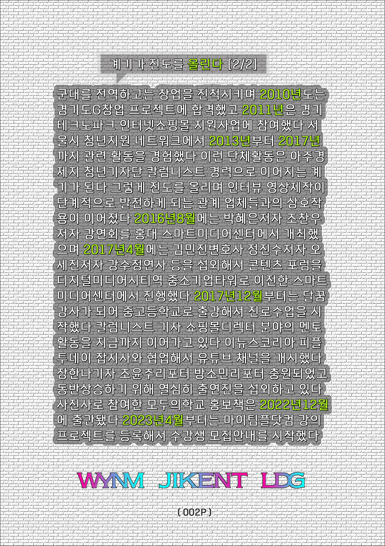 군대를 전역하고는 창업을 진척시키며 2010년도는경기도G창업 프로젝트에 합격했고 2011년은 경기테크노파크 인터넷쇼핑몰 지원사업에 참여했다 서울시 청년지원 네트워크에서 2013년부터 2017년까지 관련 활동을 경험했다 이런 단체활동은 아주경제지 청년기자단 칼럼니스트 경력으로 이어지는 계기가 된다 그렇게 진도를 올리며 인터뷰 영상제작이단계적으로 발전하게 되는 관계 업체들과의 상호작용이 이어졌다 2016년8월에는 박혜은저자 조찬우저자 강연회를 홍대 스마트미디어센터에서 개최했으며 2017년4월에는 김민진변호사 정진수저자 오세진저자 강수정연사 등을 섭외해서 콘텐츠 포럼을디지털미디어시티역 중소기업타워로 이전한 스마트미디어센터에서 진행했다 2017년12월부터는 달꿈강사가 되어 중고등학교로 출강해서 진로수업을 시작했다 칼럼니스트 기자 쇼핑몰디렉터 분야의 멘토활동을 지금까지 이어가고 있다 이뉴스코리아 피플투데이 잡지사와 협업해서 유튜브 채널을 개시했다장한나기자 조윤주리포터 방소민리포터 충원되었고동반상승하기 위해 열심히 출연진을 섭외하고 있다사진사로 참여한 모두의학교 홍보책은 2022년12월에 출간됐다 2023년4월부터는 마이팀플닷컴 강의프로젝트를 등록해서 수강생 모집안내를 시작했다