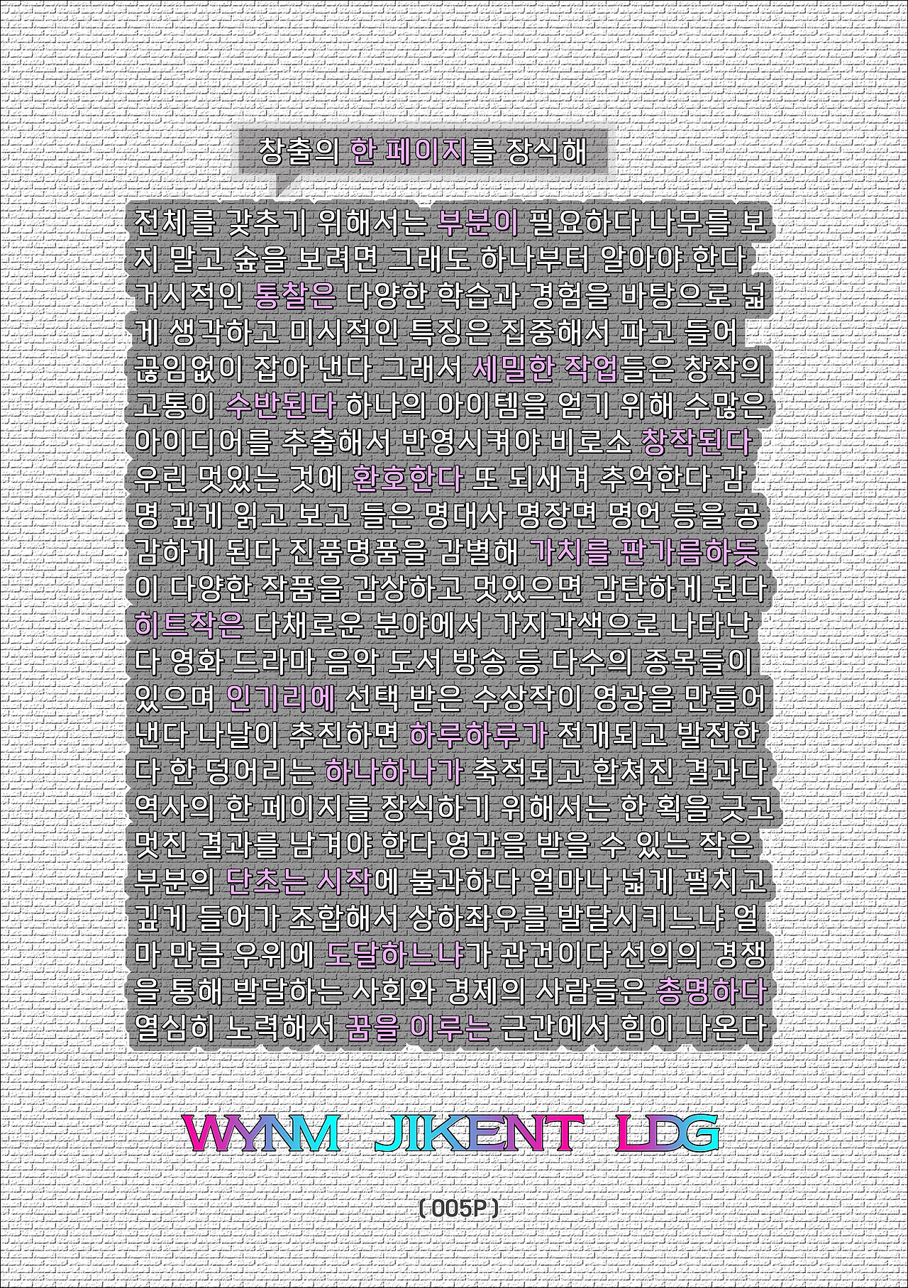전체를 갖추기 위해서는 부분이 필요하다 나무를 보지 말고 숲을 보려면 그래도 하나부터 알아야 한다 거시적인 통찰은 다양한 학습과 경험을 바탕으로 넓게 생각하고 미시적인 특징은 집중해서 파고 들어 끊임없이 잡아 낸다 그래서 세밀한 작업들은 창작의고통이 수반된다 하나의 아이템을 얻기 위해 수많은 아이디어를 추출해서 반영시켜야 비로소 창작된다 우린 멋있는 것에 환호한다 또 되새겨 추억한다 감명 깊게 읽고 보고 들은 명대사 명장면 명언 등을 공감하게 된다 진품명품을 감별해 가치를 판가름하듯이 다양한 작품을 감상하고 멋있으면 감탄하게 된다 히트작은 다채로운 분야에서 가지각색으로 나타난다 영화 드라마 음악 도서 방송 등 다수의 종목들이있으며 인기리에 선택 받은 수상작이 영광을 만들어낸다 나날이 추진하면 하루하루가 전개되고 발전한다 한 덩어리는 하나하나가 축적되고 합쳐진 결과다역사의 한 페이지를 장식하기 위해서는 한 획을 긋고멋진 결과를 남겨야 한다 영감을 받을 수 있는 작은부분의 단초는 시작에 불과하다 얼마나 넓게 펼치고깊게 들어가 조합해서 상하좌우를 발달시키느냐 얼마 만큼 우위에 도달하느냐가 관건이다 선의의 경쟁을 통해 발달하는 사회와 경제의 사람들은 총명하다 열심히 노력해서 꿈을 이루는 근간에서 힘이 나온다