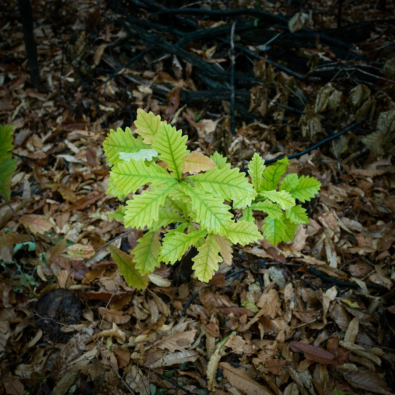 떨어진 참나무 잎들이 가득한데,