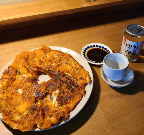 집에 오징어가 없어서 김치만 마구 넣은 김치전 반죽이 완성되었다. 마침 언니가 주말에 '백화수복'을 챙겨줬다. 김치전과 환상의 조합이다. 가운데 원형으로 뚫혀있어 뒤집을려고 하니 찢어질 것 같았다.