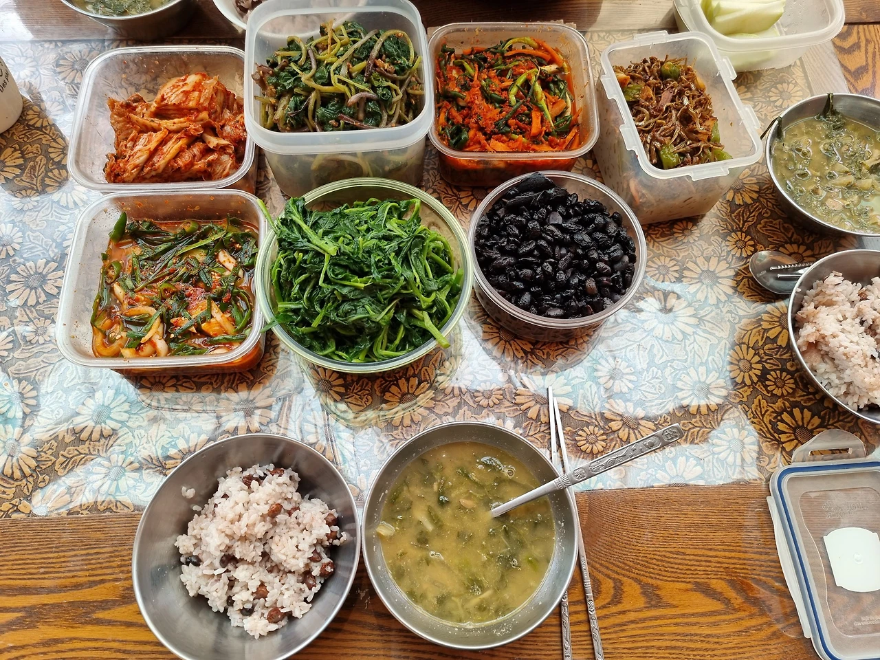 다음 날, 아부지와 어무니는 제일 먼저 하루를 시작하셨고, 그다음으로 내가, 아주 한참 뒤에 동생이 일어났다. 엄마가 밭일을 하는 사이, 어제 '엄마가 만든 쑥국'을 데우고 '엄마가 미리 불려놓은 콩'을 넣어 밥을 안쳤다. 곧 아부지와 어무니가 식사를 하시러 오신다. 어무니의 손이 더해져 아침상이 완성된다. 옆집 할머니가 주신 콩으로 만든 콩장이 참 부드럽고 맛있다. 산나물과 파김치, 머위나물(?)도 꿀꺽꿀꺽 넘어간다.