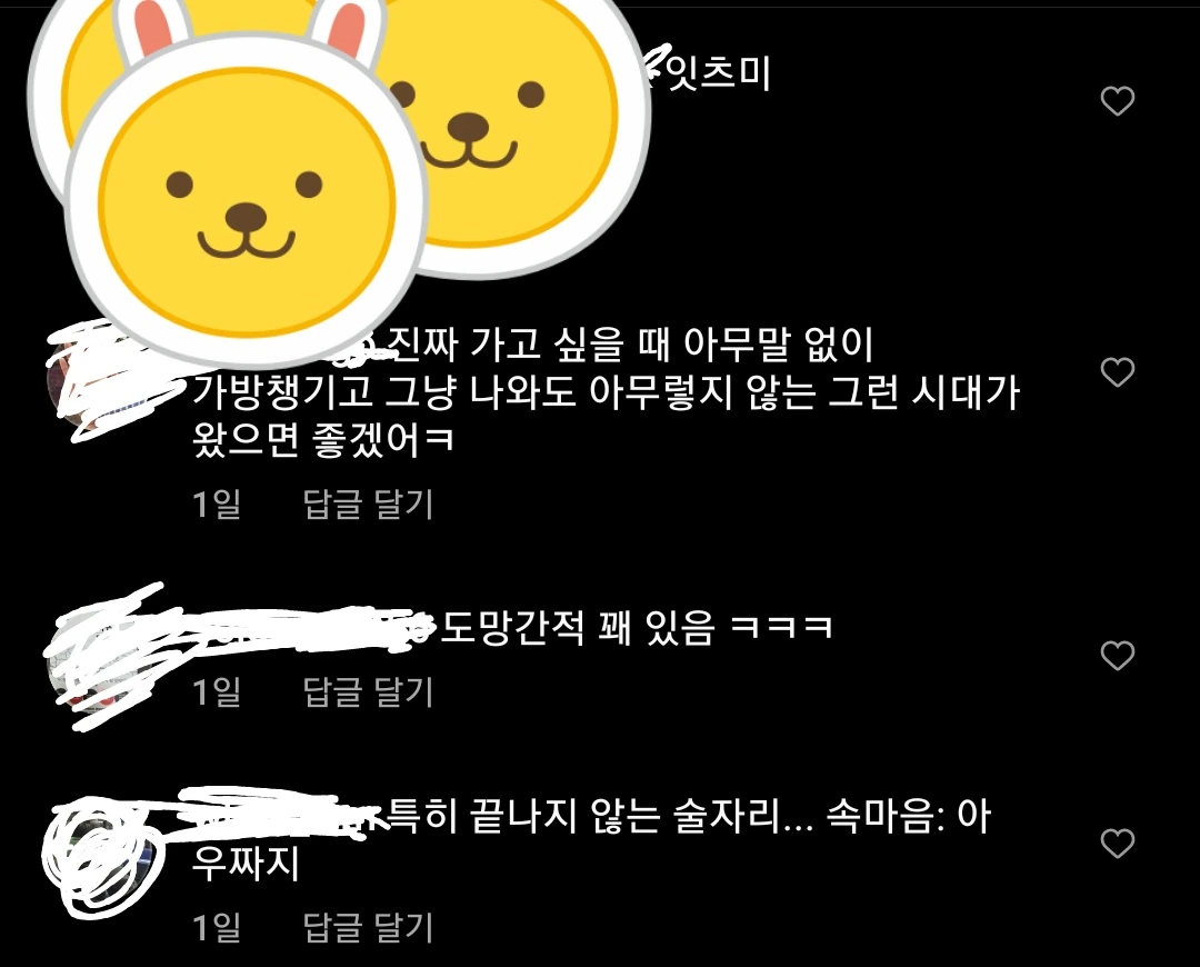 나한테는 어떤 사진이나 짤(이미지/gif파일 등)이 참 재밌지만, 그들에겐 '노잼'일 수 있기에.. 노잼인 것 마저도 이해해주고 대강 넘겨생각해줄 남친이나, 남동생 같은 가까운 사이가 아닌 이상 그런 것들을 굳이 남들과 공유하지 않으려 한다.남친과 남동생에게는 어떤 반응이 오더라도 상처받지 않고, 어떤 대답을 기대하지 않아도 되니 더 편한 것도 있다.