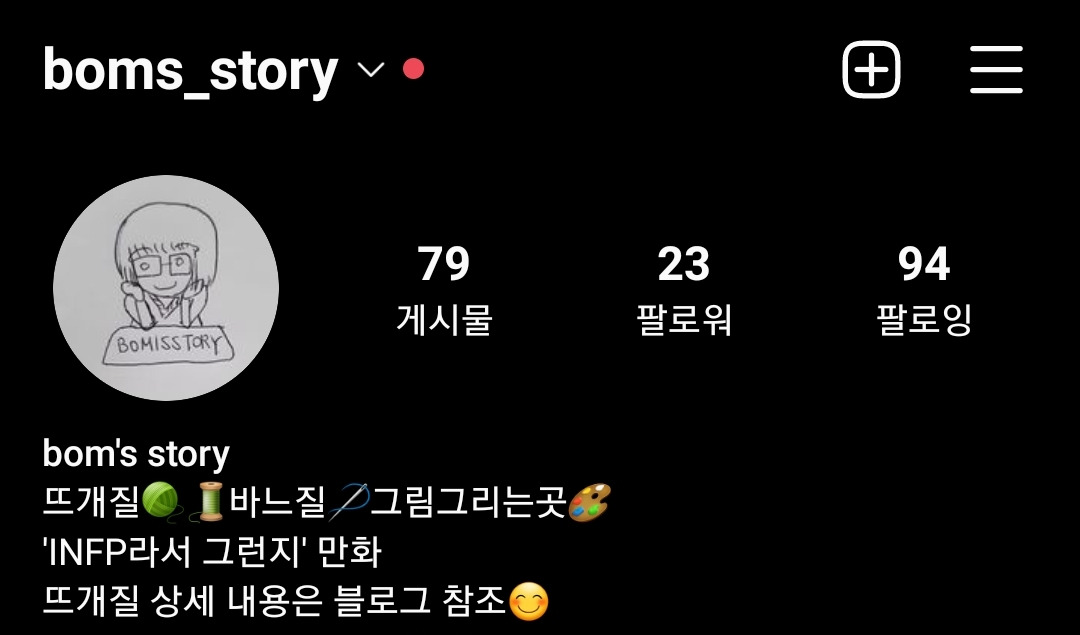 작년 겨울 동안 새로이 취미로 즐겼던 뜨개질, 큰 소질은 없지만 가끔 그리는 그림 등의 취미생활의 결과물을 올리는 공개 계정 하나입니다. 후자의 공개 계정은 주로 비슷한 창작을 하시는(그림, 만화 등) 얼굴 모르는 몇 작가님들의 계정의 소식을 듣는 용도로 쓰고 있습니다.