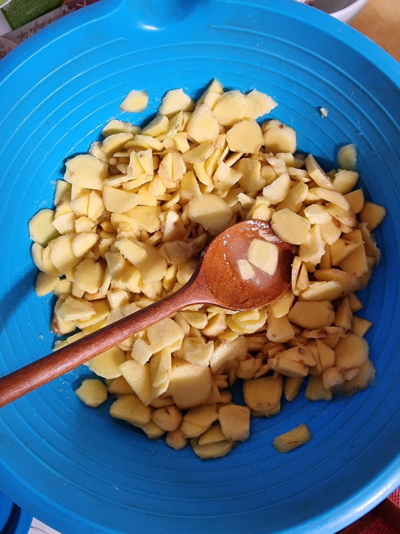 겨우겨우 제멋대로 썬 생강에, 엄마가 시키는 대로 설탕과 꿀을 넣는다. 제대로 넣었는지는 모르겠지만, 나중에 엄마가 보고는 뭐를 좀 덜 넣은 거 같다신다.