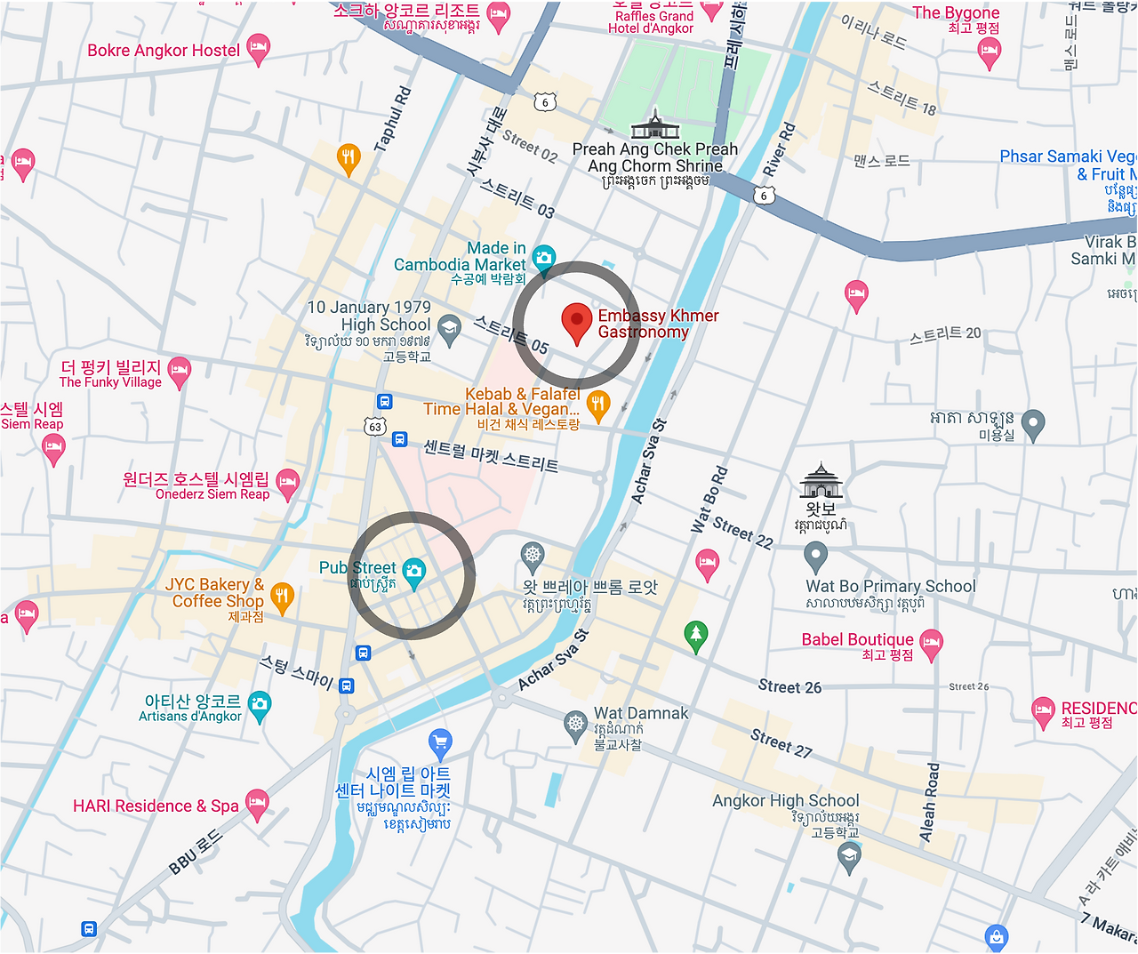 Embassy 레스토랑의 위치는 시내 중심가이자 관광지로 많이 알려져 있는 'Pub Street'와 그리 멀지 않다. 대부분의 많은 식당이나 카페, 술집들은 씨엠립을 가로지르는 작은 천인 씨엠립강을 두고 좌우로 많이 포진해 있는데, Embassy는 그보다는 좀 한적한 안쪽에 위치하여 있어 오히려 아늑한 느낌마저 있고, 식사 후에 소화도 시킬 겸 천천히 주변을 산책하는 것도 좋은 선택지가 될 수 있다.