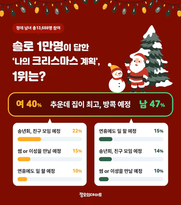 소셜 데이팅 앱 정오의 데이트에 따르면 총 1만 3688명이 참여한 2024년 ‘나의 크리스마스 계획은?’이라는 설문조사에서, 남녀 모두 1위로 ‘추운데 집이 최고, 방콕 예정’이라는 답변이 선정됐다고 한다.