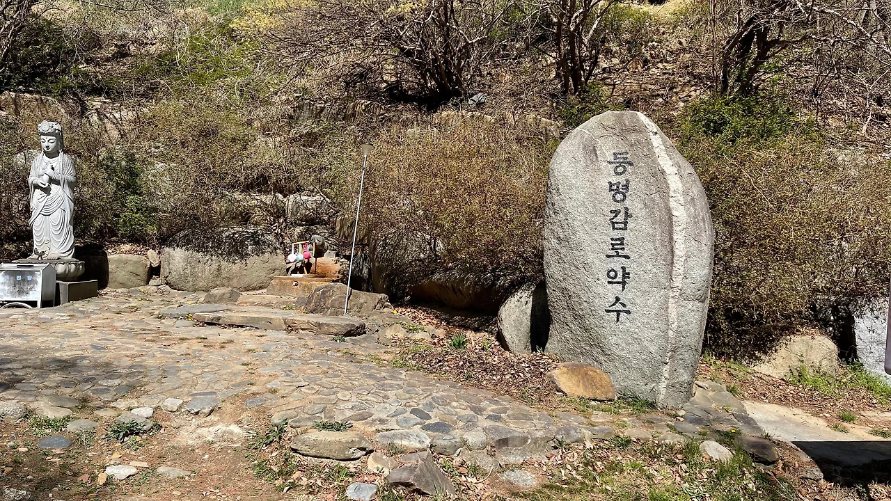 벚꽃이 만개한 주차장에 차를 세우고 천천히 걸어서 '괘방산 등명낙가사'이라 새겨진 현판과 화려한 오방색 단청이 아름다운 사찰 입구를 지나면 예쁘게 단장된 길이 나오는데, 이를 조금만 따라 걸어 올라가게 되면, 시원한 약수를 먹을 수 있는 등명 감로 약수터가 나온다.