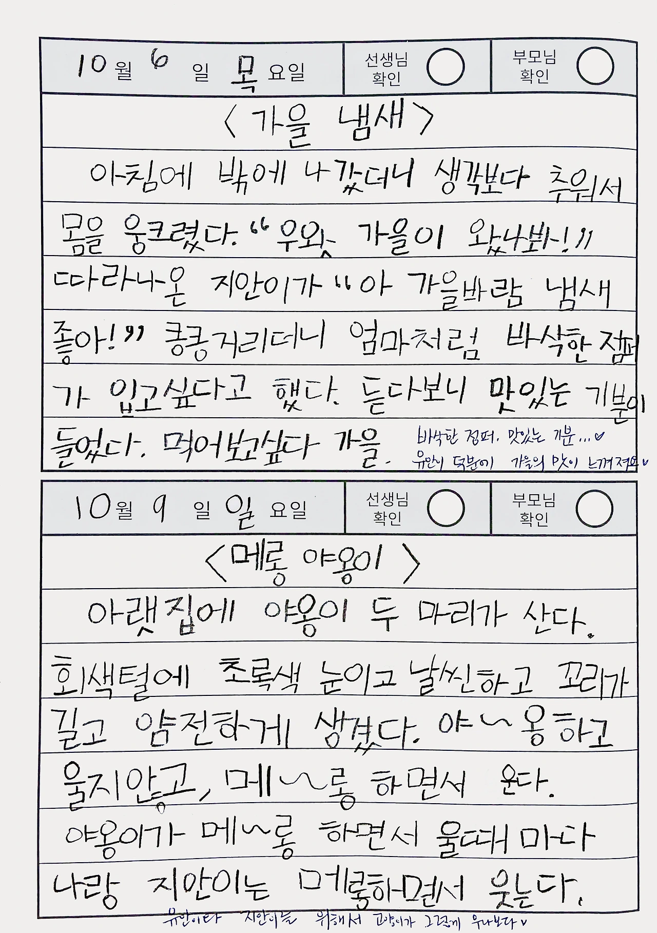때문에 계절의 변화도 온몸으로 느낄 수 있다. 어느새 가을이 성큼 다가온 날, 학교에 가려고 문을 열었더니 아이들이 모든 감각을 활짝 열고 새로운 계절을 받아들이고 있었다. 한껏 엄살 부리며 몸을 웅크리면서 춥다는 둥, 킁킁대면서 공기가 달콤하다는 둥, 하늘이 색이 더 진해지고 높아졌다는 둥, 손바닥을 내밀며 바람이 가벼워졌다는 둥 학교 가는 길 내내 분명 오늘부터 가을이 시작되었다는 이야기가 한창이었다.