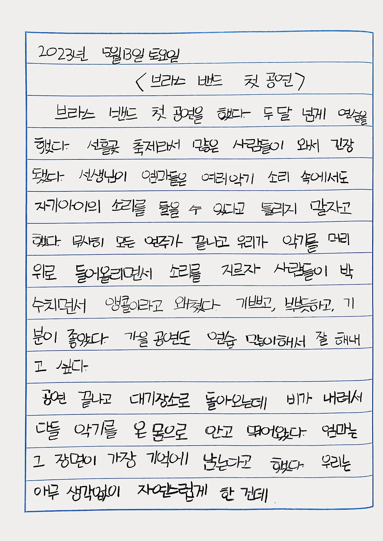 5월 13일, 마을축제에서 첫 공연이 있었다. 전체 45명 중 올해 처음 합류한 아이들이 절반이나 되고, 세 달이 채 안 되는 연습기간이었다. 긴장한 표정의 아이들이 귀여웠는데, 연주를 시작하자마자 소름이 돋았다. 진지한 눈빛과 웅장한 하모니는 가슴을 울리게 했다. 마지막 음이 끝나자 상기된 볼로 환호성을 지르며 다 같이 악기를 번쩍 들어 올리는데, 뜨거움을 삼키며 그저 박수만 치고 있었다. 선배들의 공연이 끝나자, 연주하는 내내 눈 한 번 떼지 않고 숨소리도 내지 않던 지안이가 말했다.