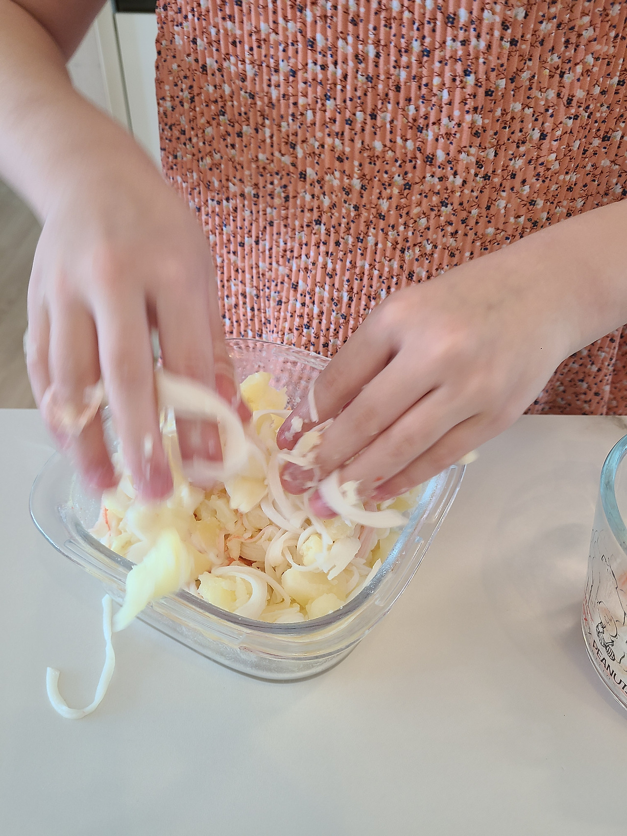 잘게 찢은 게맛살을 익힌 감자와 버무리는 차례, 그릇 밖을 탈출하는 재료가 식탁을 어지럽힌다.